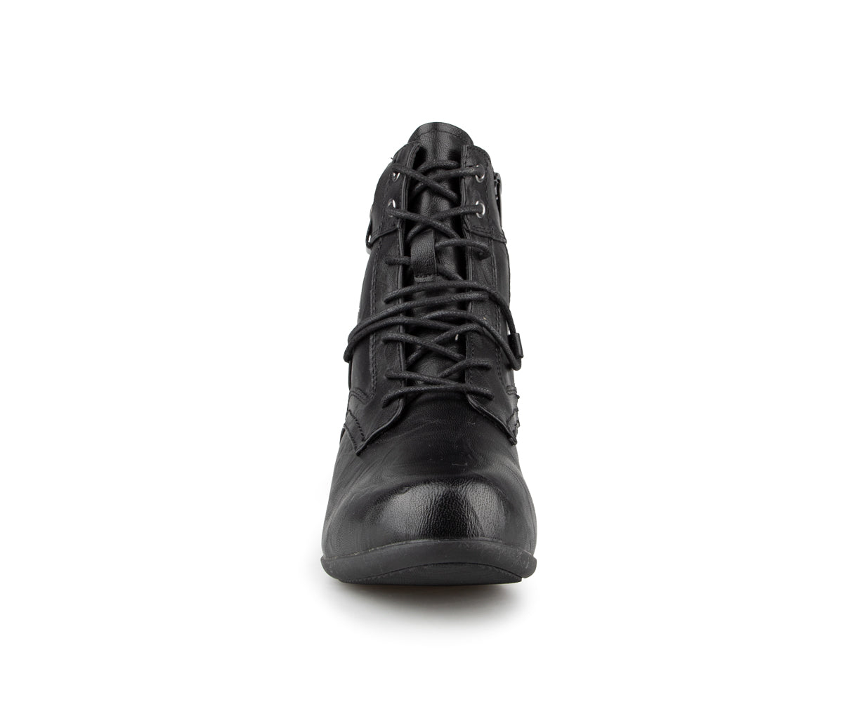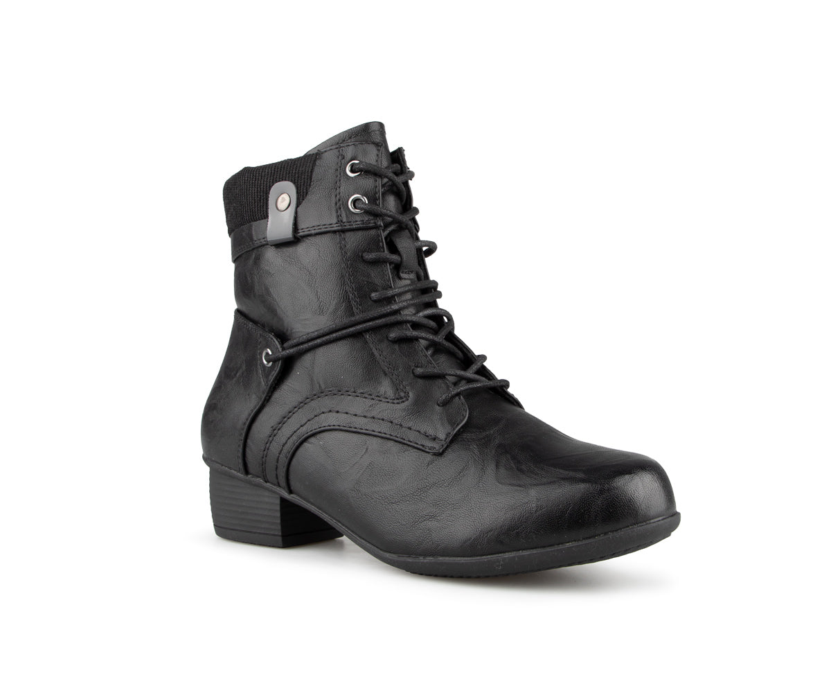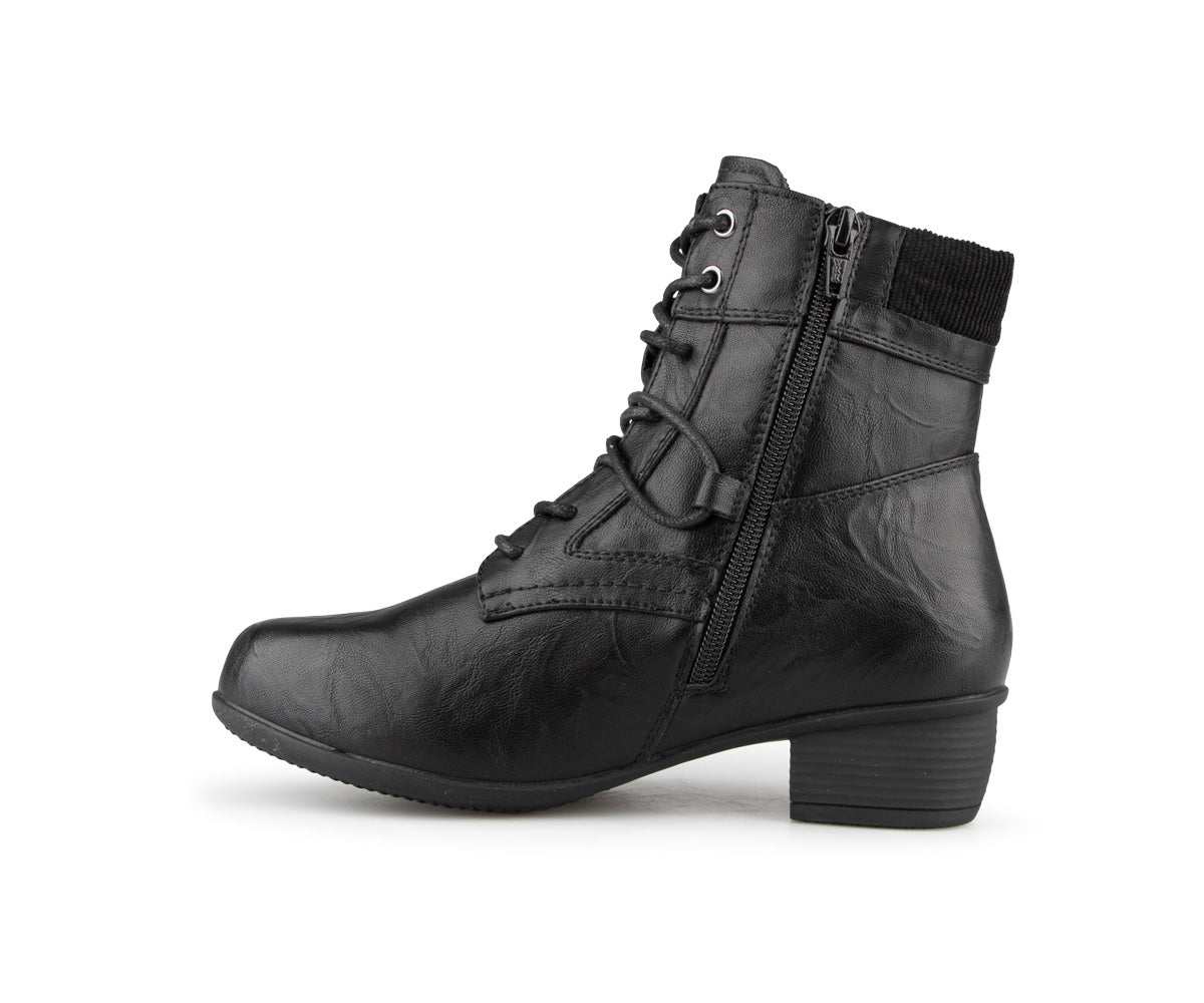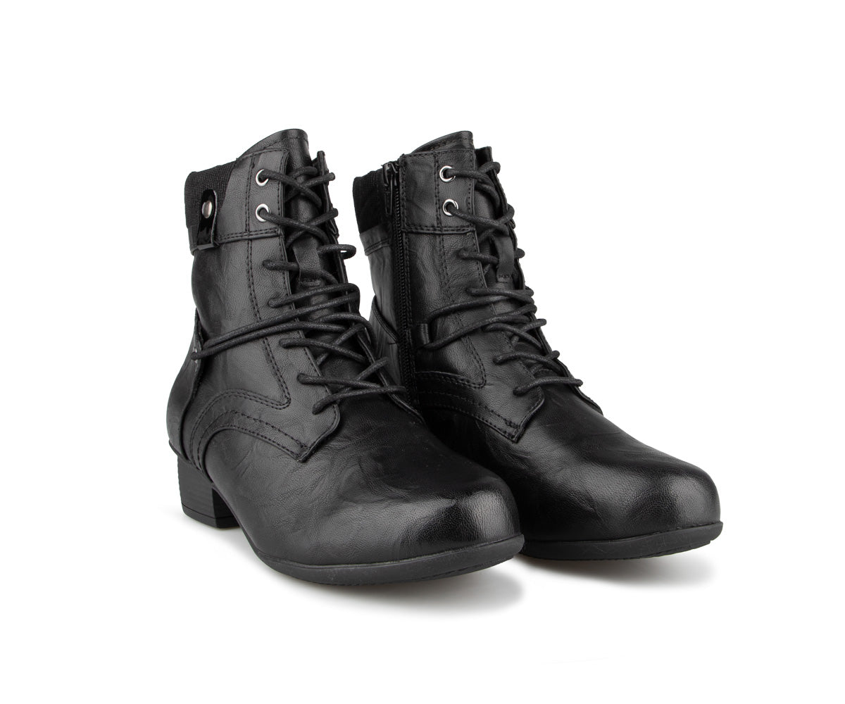 Ces bottillons courts Ultime Confort pour femmes combinent style et praticité. Ils sont munis de lacets ainsi que d'une fermeture éclair intérieure YKK pour un enfilage facile. Conçus en cuir synthétique, ces bottillons sont dotés d'un talon carré pour plus de stabilité et d'une petite doublure en imitation de fourrure courte pour un confort supplémentaire. La semelle extérieure en TPR assure une durabilité accrue et une bonne adhérence.
