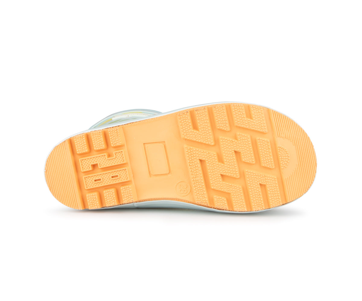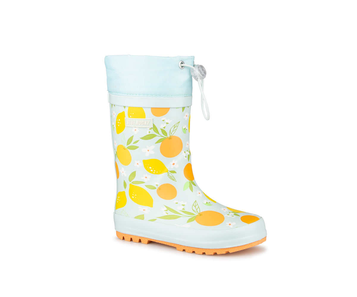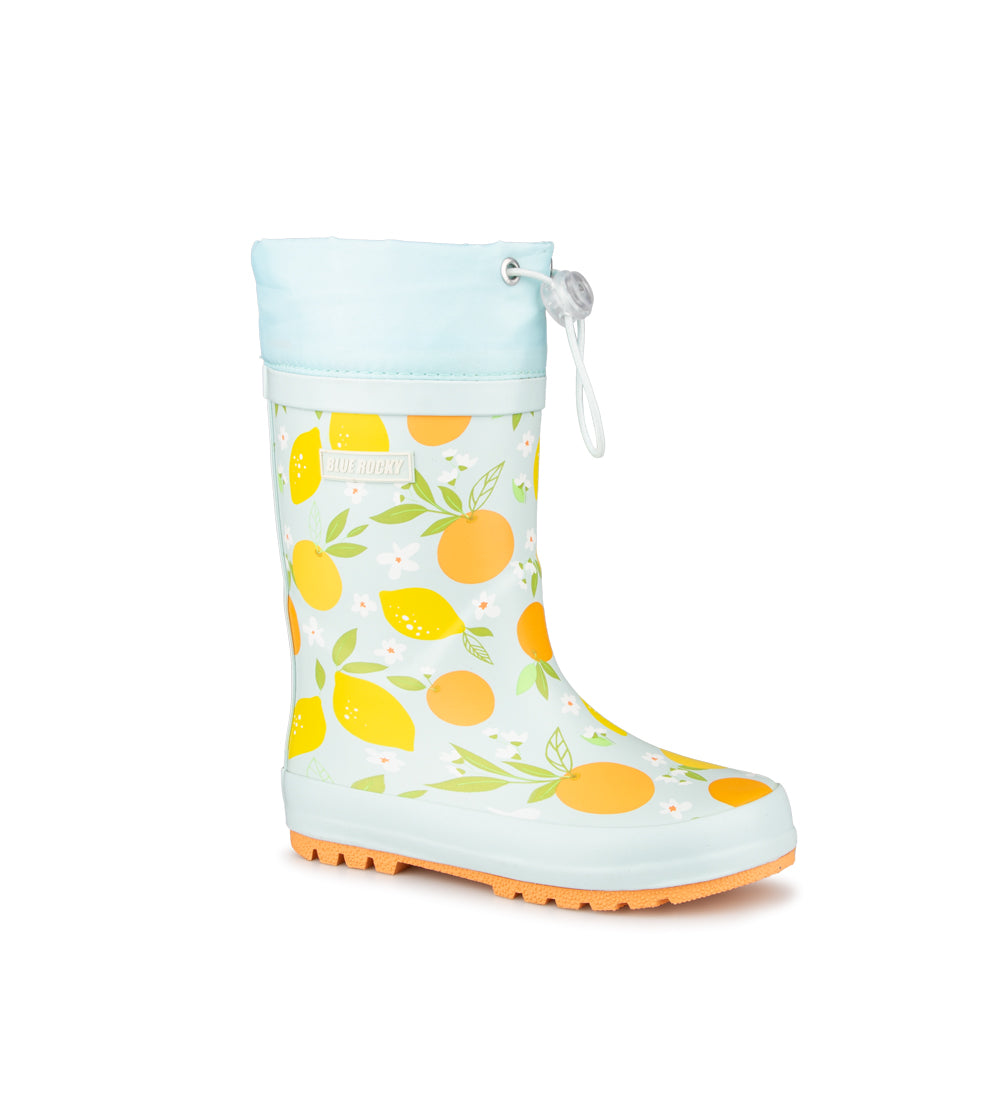 Ces bottes de pluie Blue Rocky pour petits enfants arborent des motifs colorés, un collet en nylon ajustable, une hauteur mi-mollet, une impression amusante, une doublure en coton, un dessus en caoutchouc et une semelle en caoutchouc.