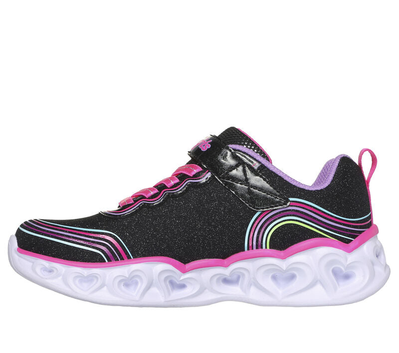 Les chaussures Heart Light pour enfants de la marque Skechers sont conçues pour être faciles à enfiler et à retirer. Doté d'une tige en maille scintillante ornée d'un motif cœur arc-en-ciel en 3D, ce modèle lumineux est équipé de lacets extensibles et d'une fermeture adaptative Skechers pour un ajustement personnalisé. Sa semelle intermédiaire sculptée comporte une « chaîne en cœur » lumineuse, ajoutant une touche de style et de fun à chaque pas.