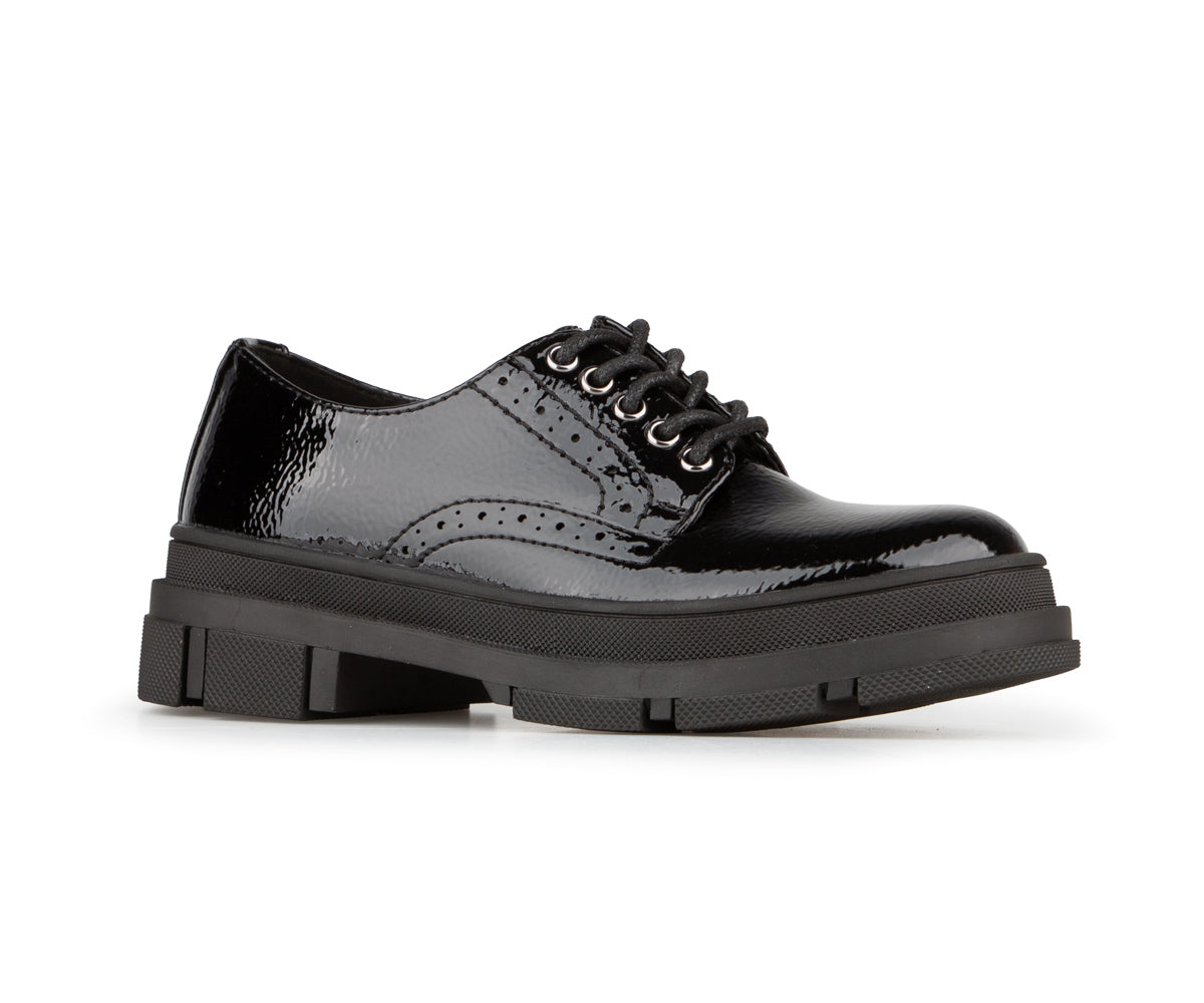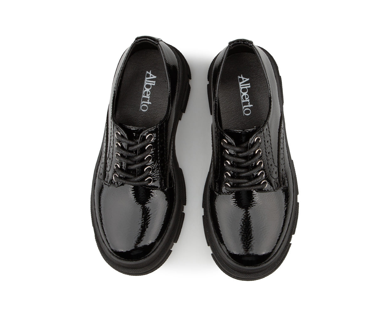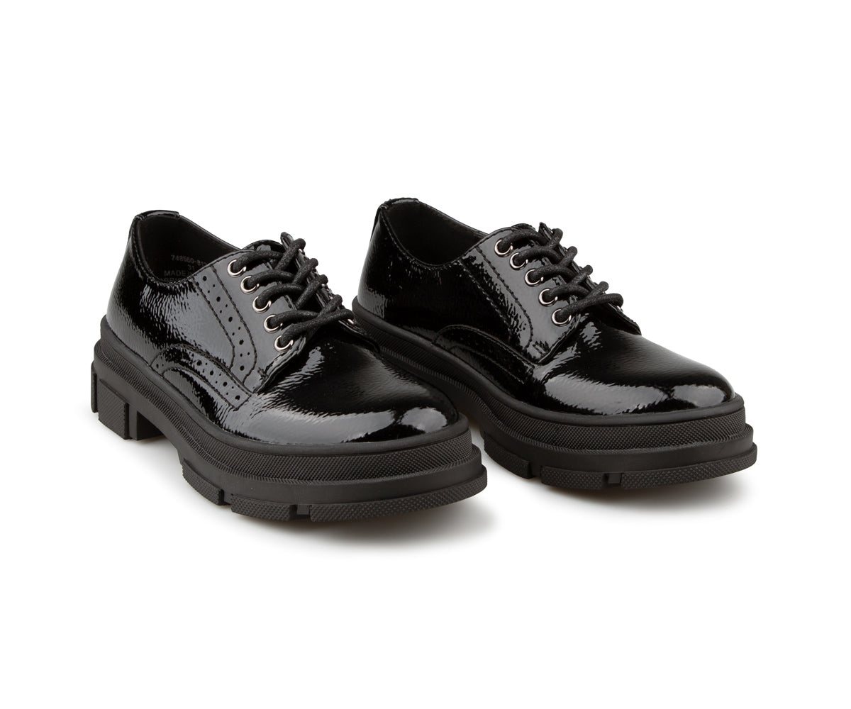 These lace-up shoes for girls combine elegance and durability with their black patent synthetic leather upper. Their thick serrated TPR sole offers good grip, while the versatile style pairs well with both dressy outfits and everyday looks.