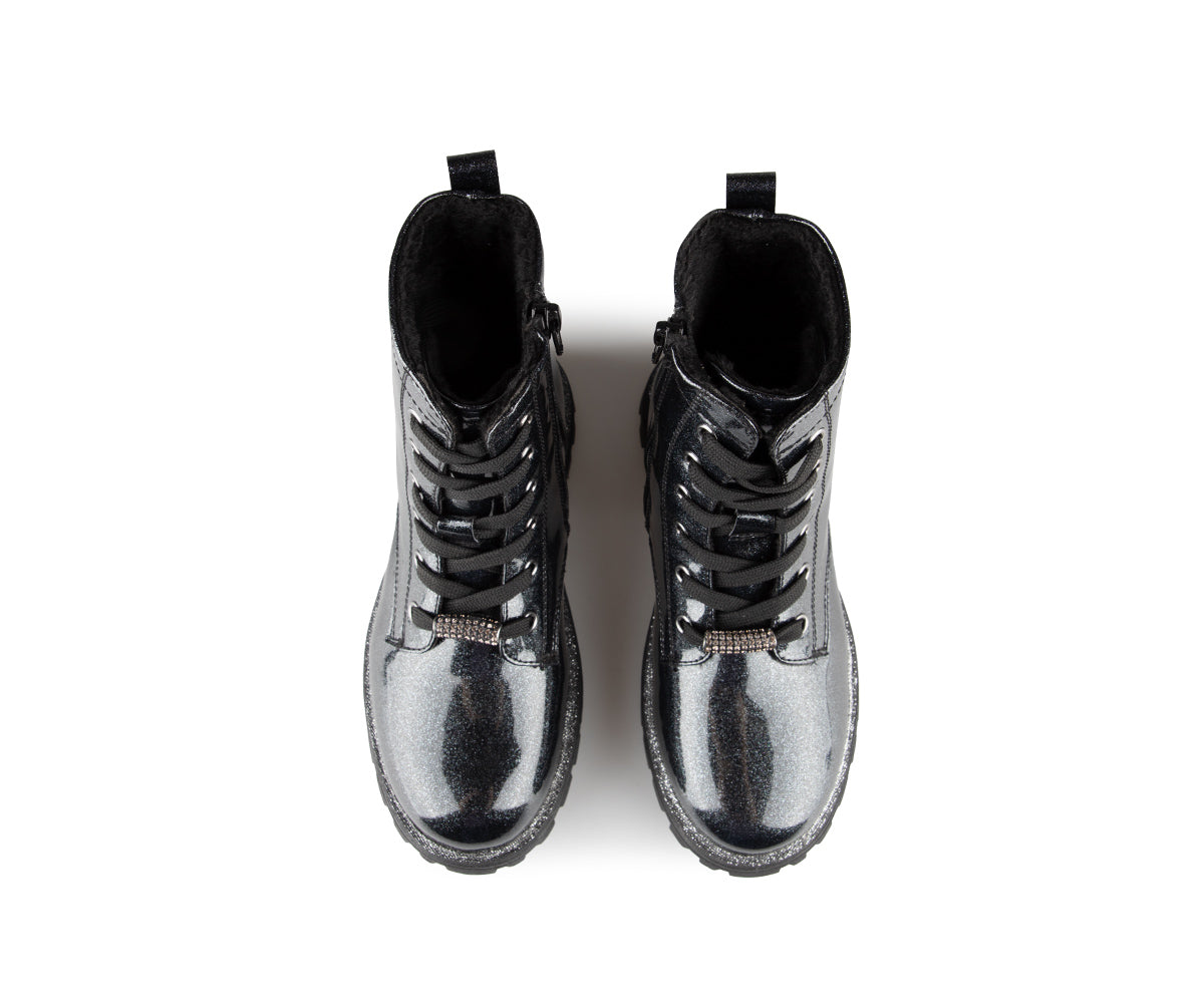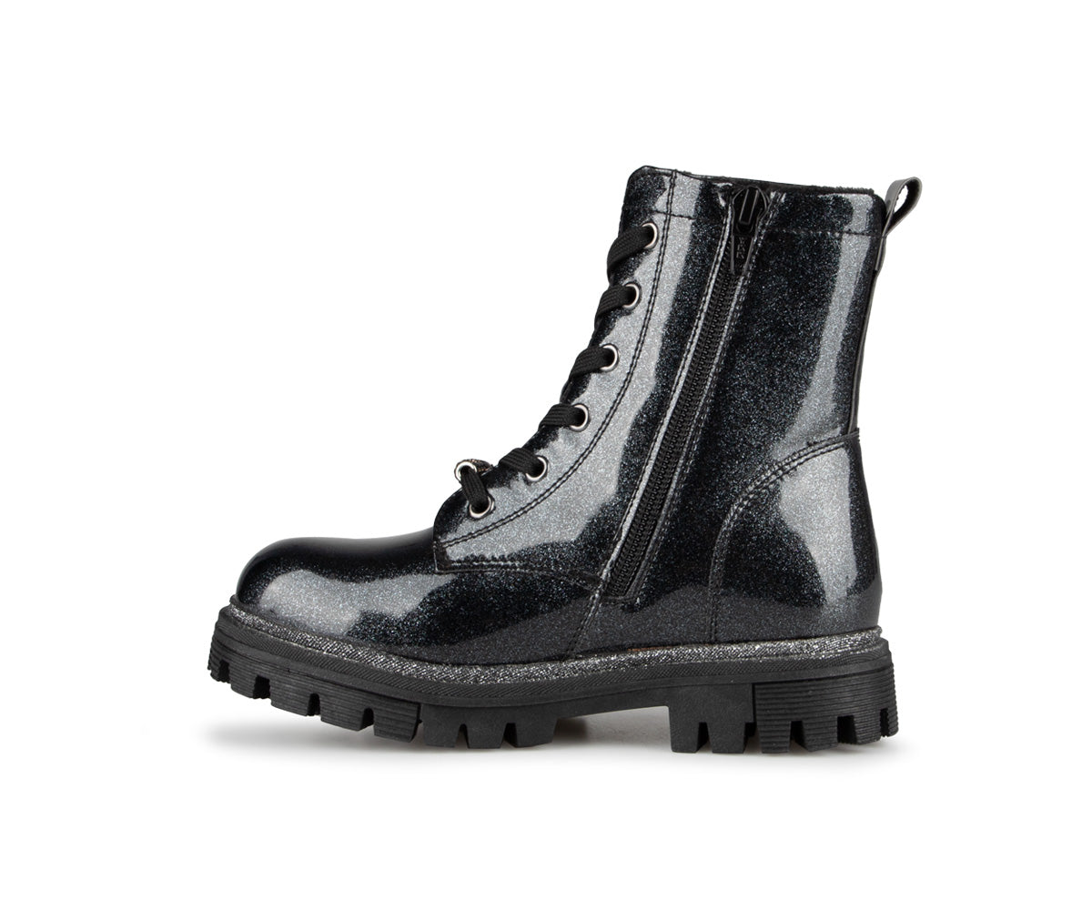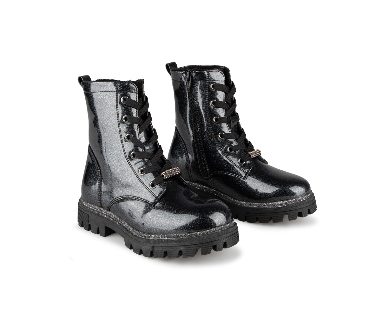 The Alberto girls' booties feature a patent faux leather upper and a soft faux fur lining. They have a flat heel and a YKK zipper for easy putting on. The insole is made of felt, while the outsole is brushed TPR, providing excellent grip and durability. These booties combine style and comfort, ideal for the cold months.