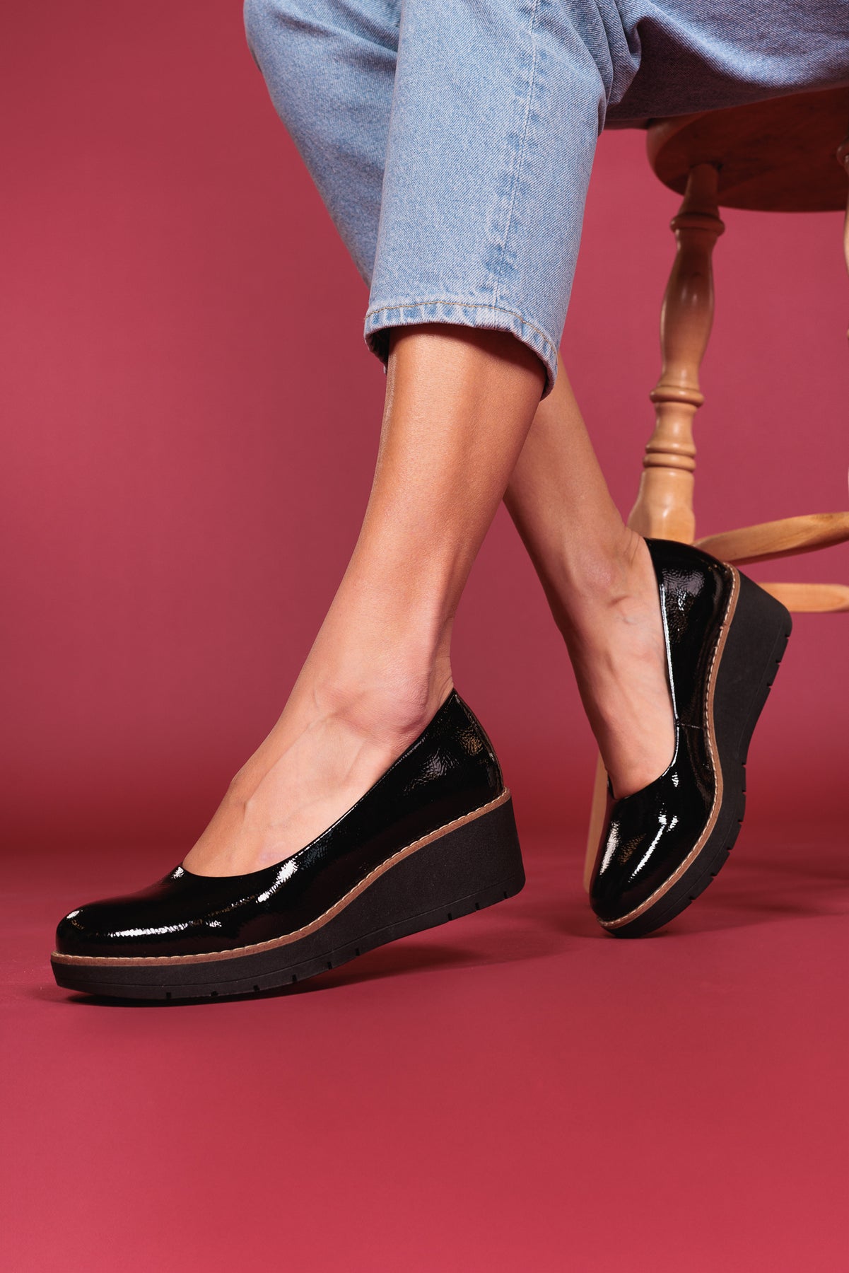 This black women's pump with a wedge heel is designed to combine refinement and comfort. Its patent finish gives it a polished look, while the removable PU insole and TPR outsole provide excellent everyday support.