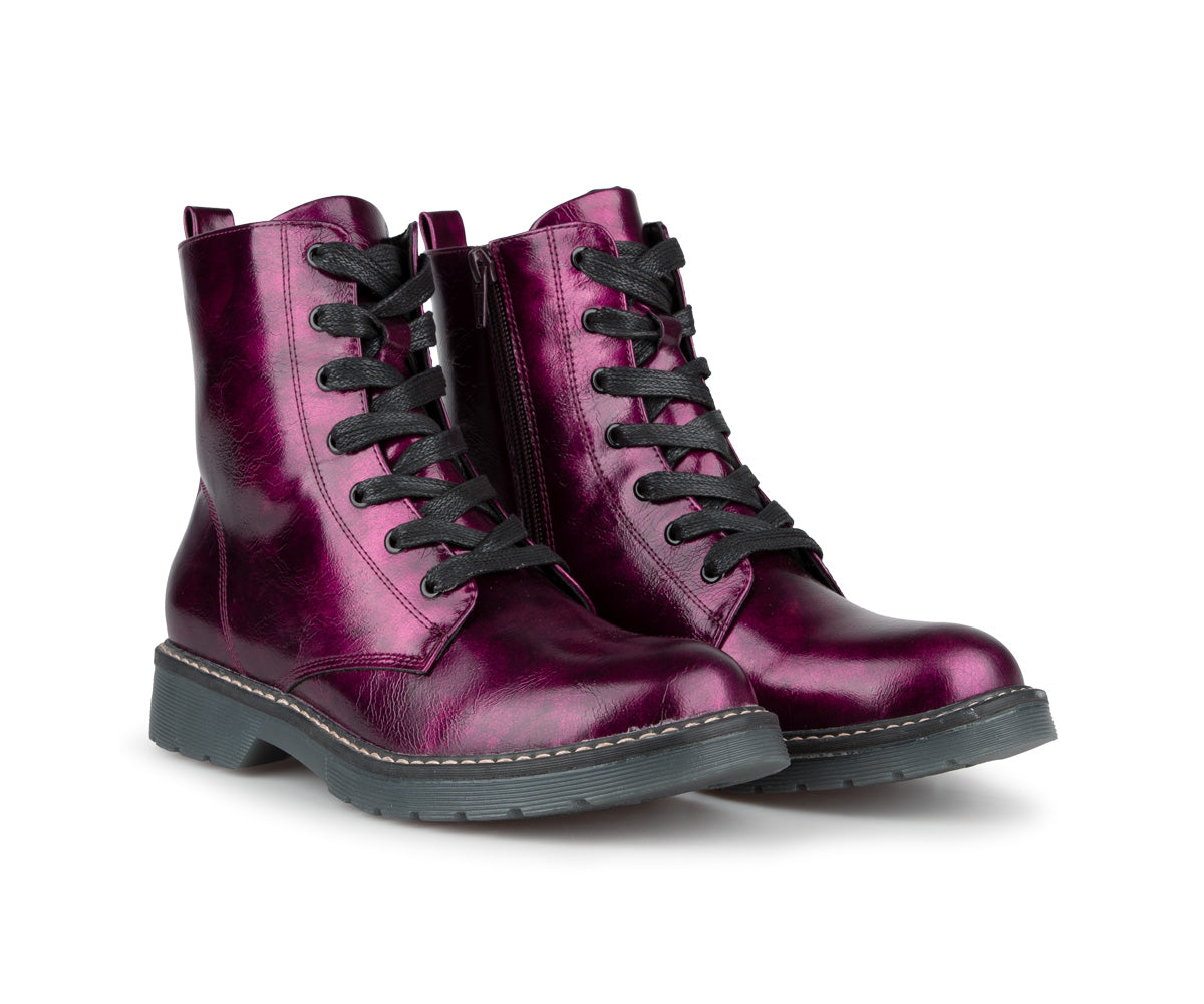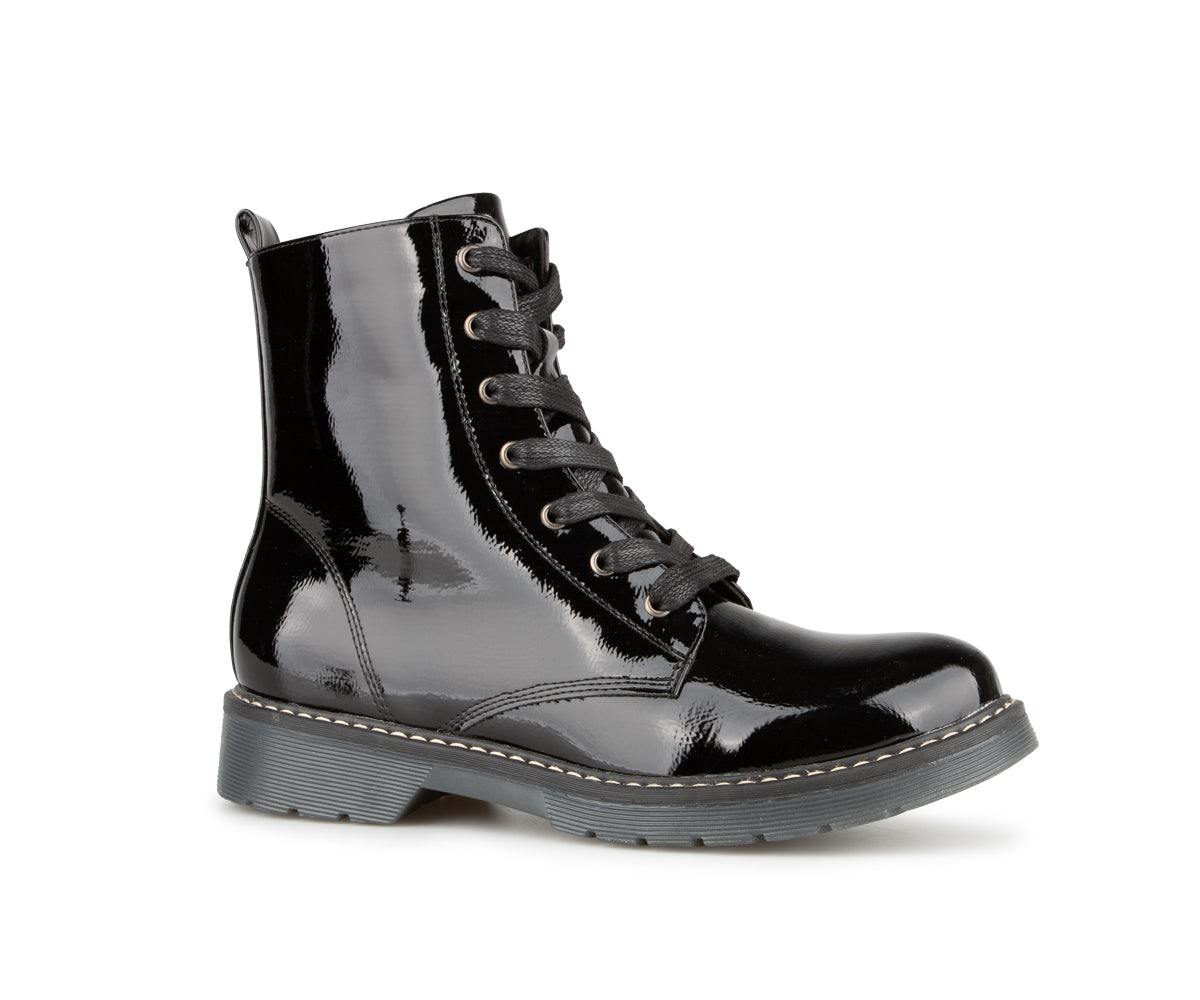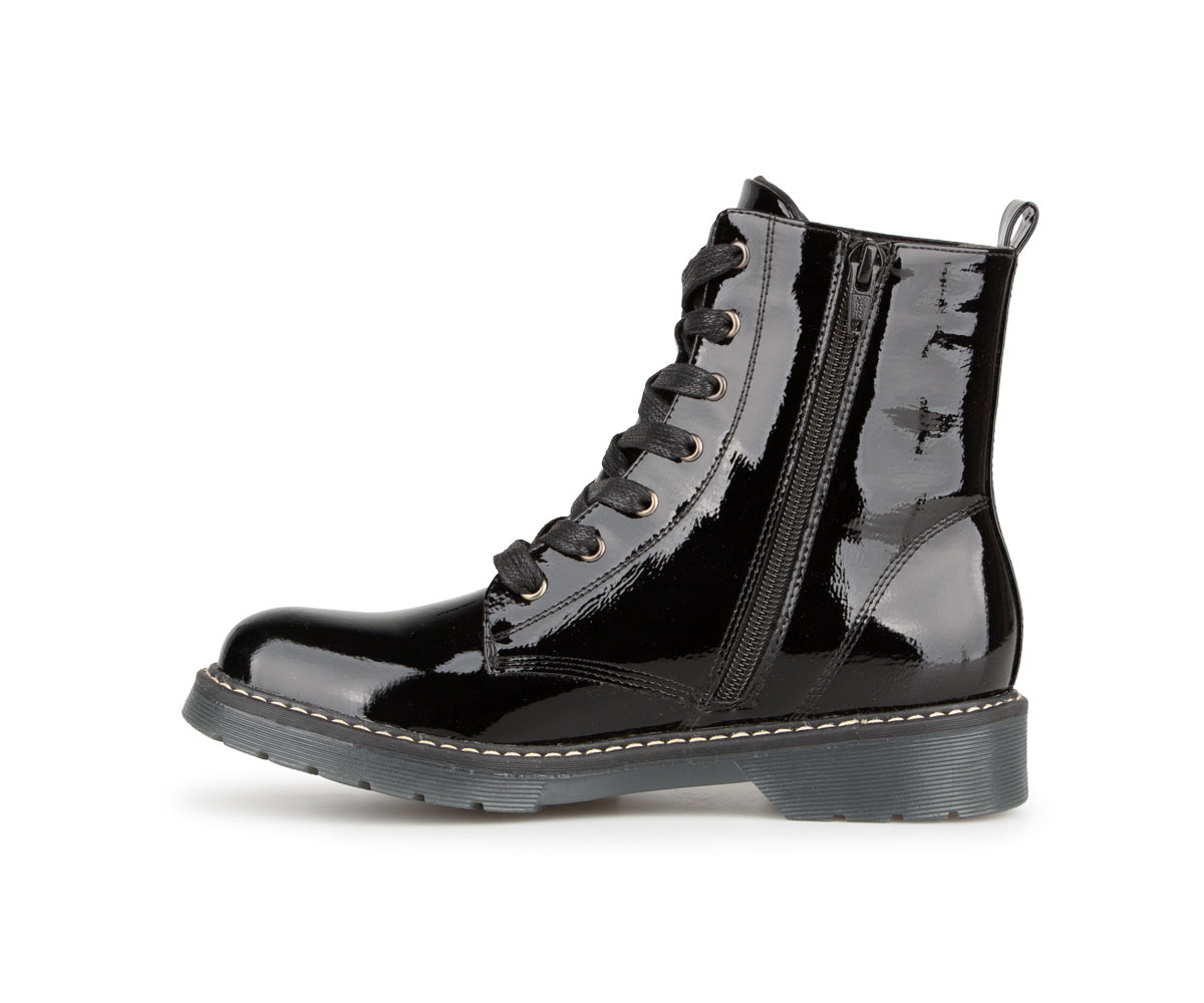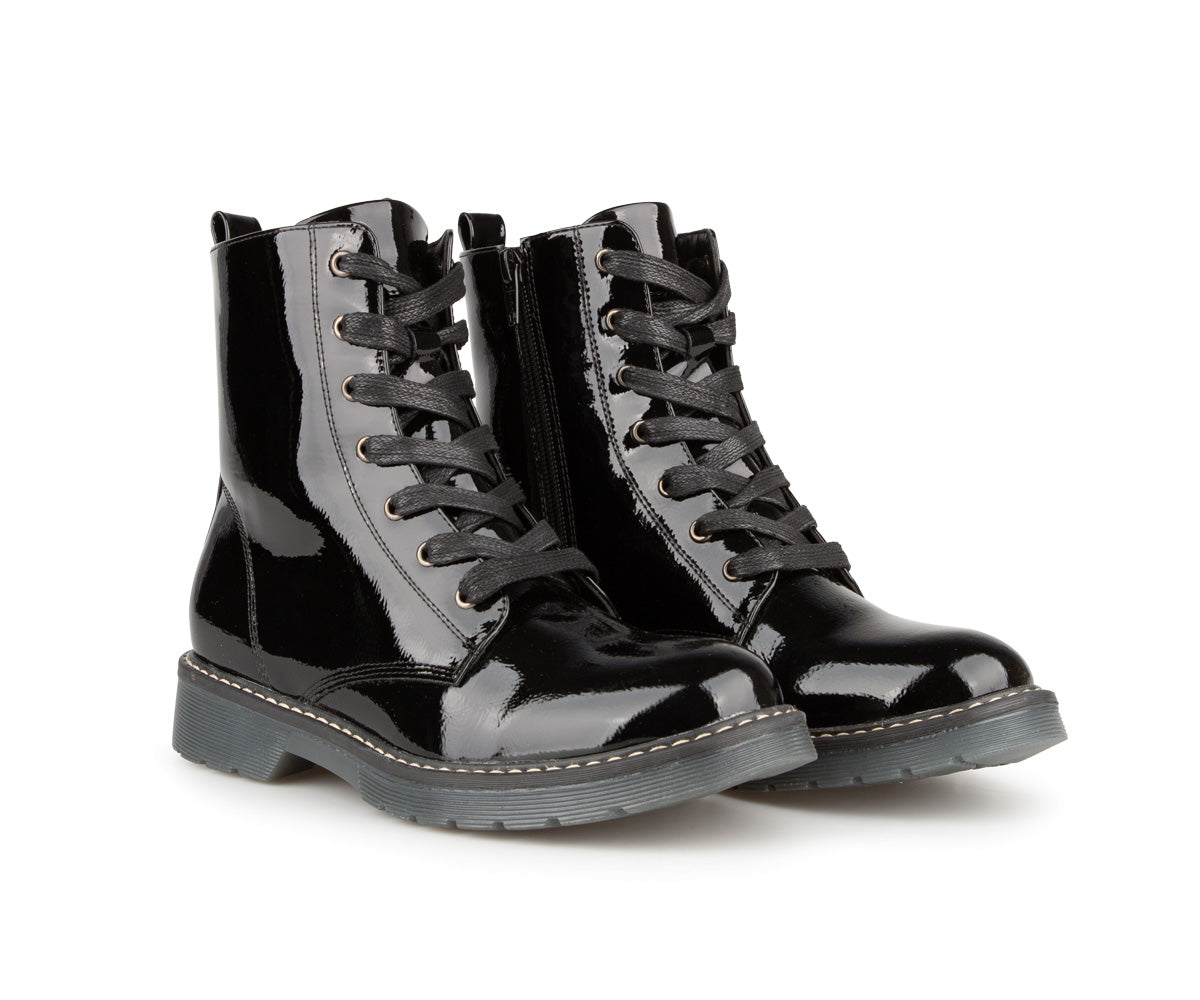 These Alberto ankle boots are perfect for adding an elegant touch to your look while staying comfortable. Made of patent/matte PU, they offer a refined shiny finish. Their jersey lining ensures soft comfort, while the 1.25-inch flat heel provides good stability. Easy to slip on thanks to their zipper and laces, they are ideal for your active days.