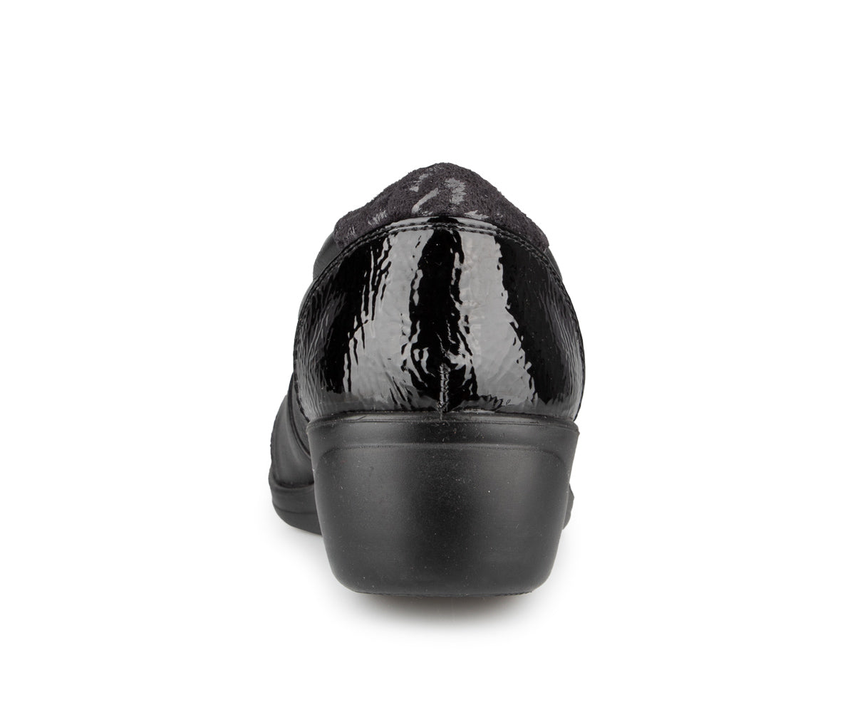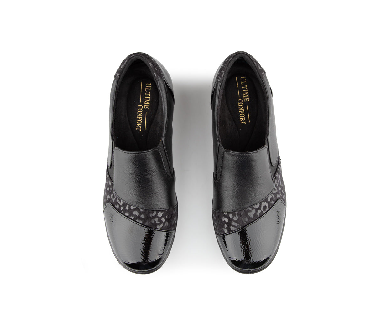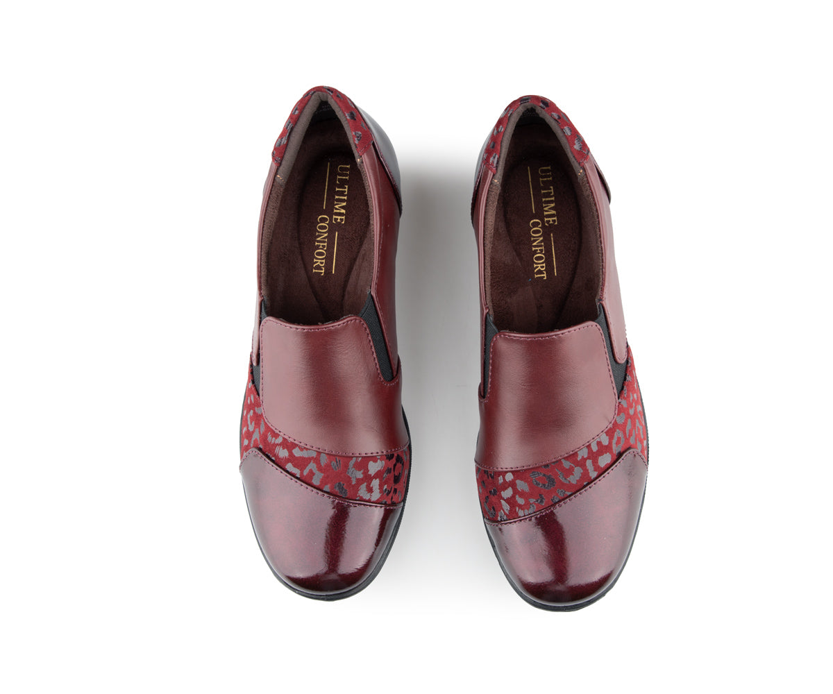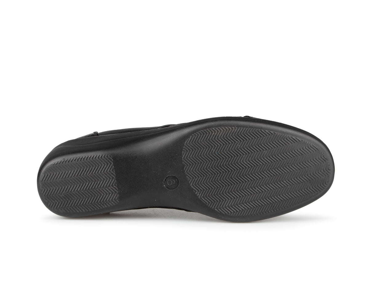 The Ultime Comfort women's loafer shoe combines style and convenience. It features an elastic upper and a 1.5-inch wedge heel, providing optimal comfort throughout the day.