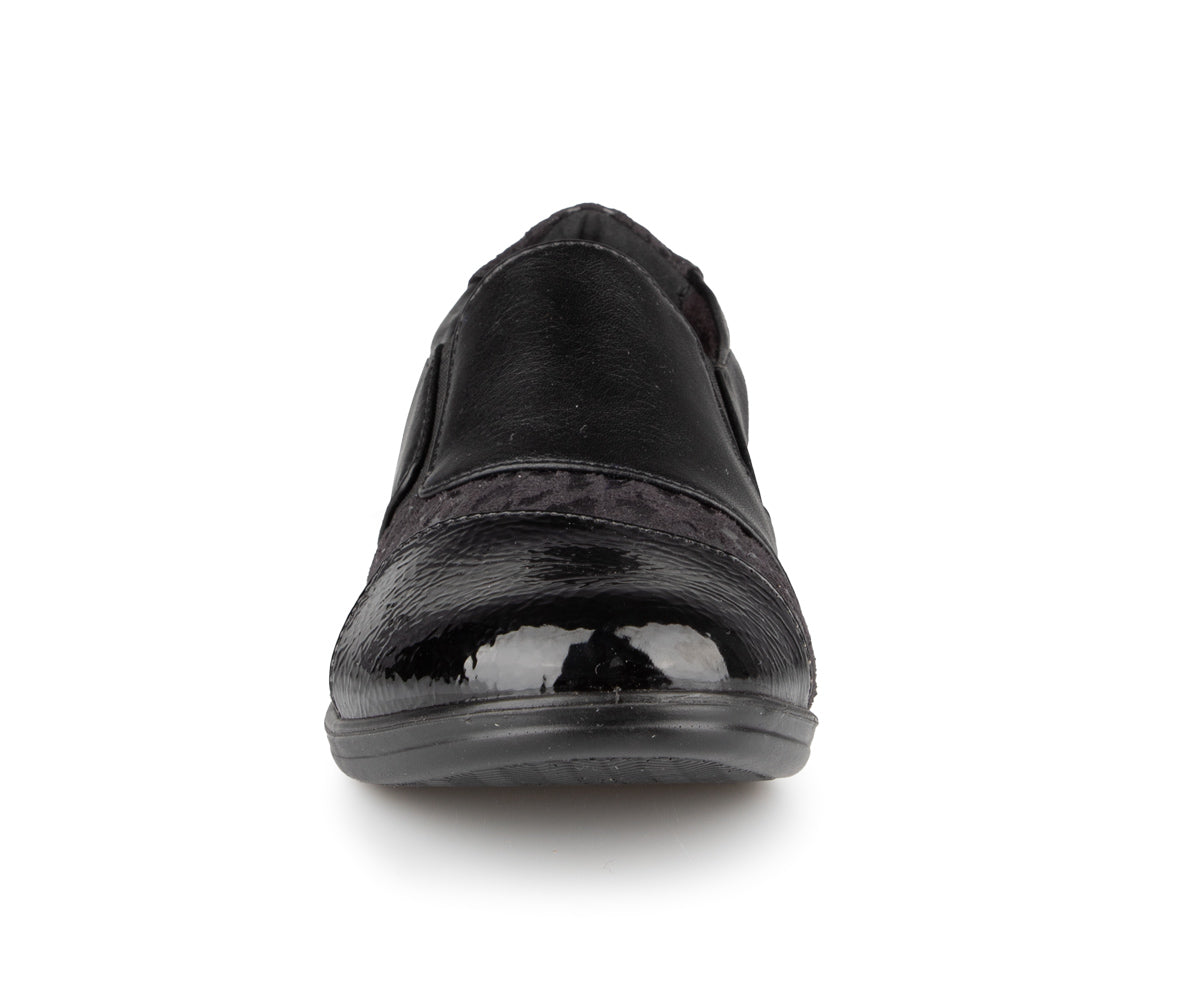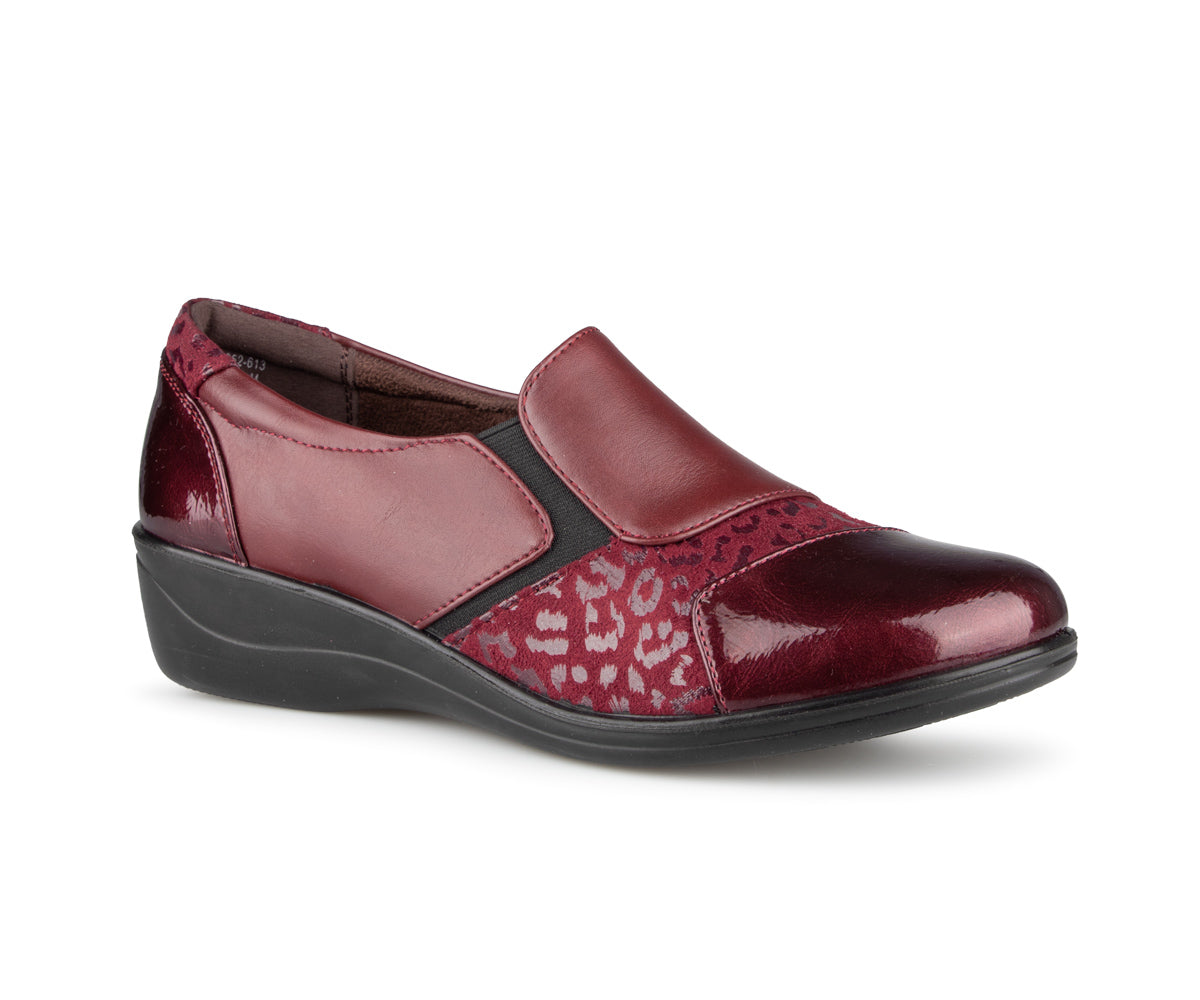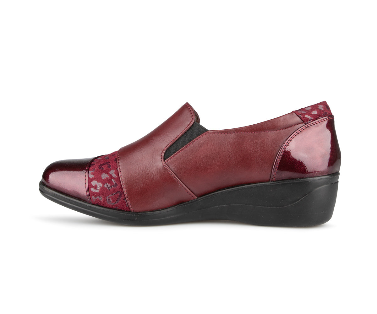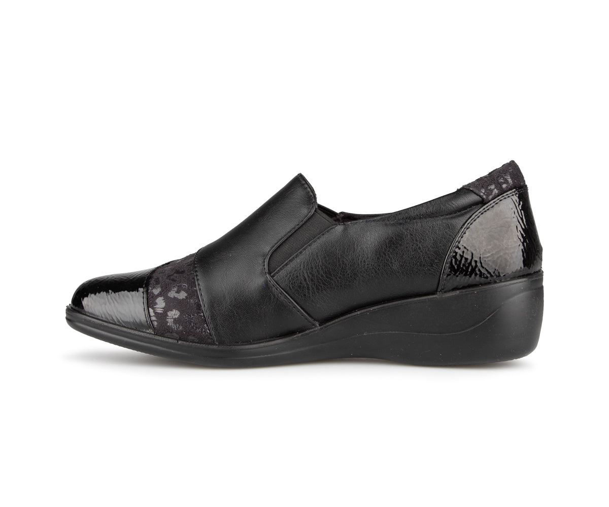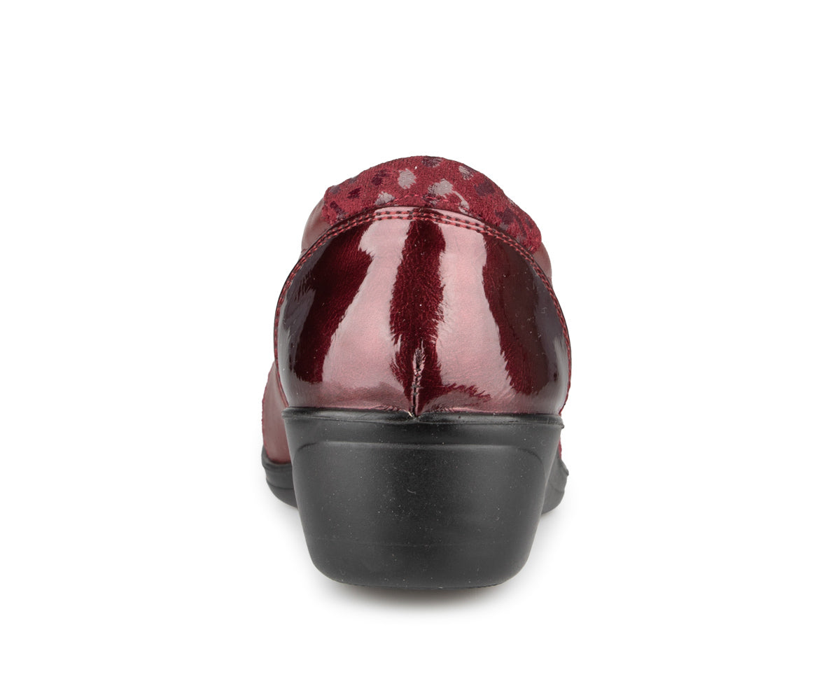 The Ultime Comfort women's loafer shoe combines style and convenience. It features an elastic upper and a 1.5-inch wedge heel, providing optimal comfort throughout the day.