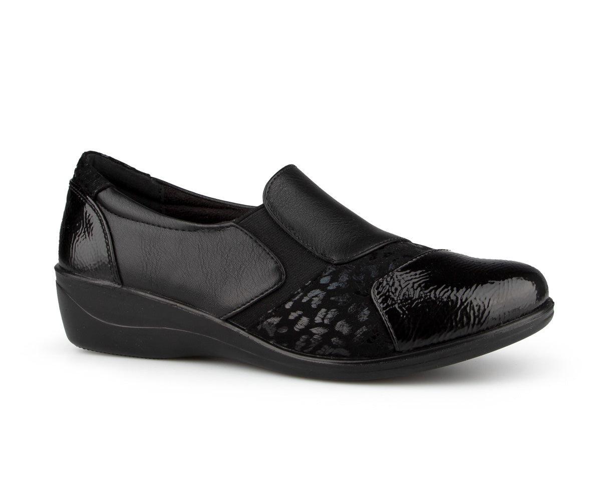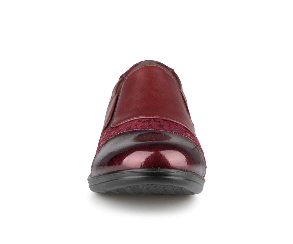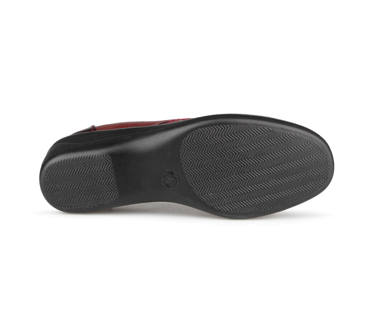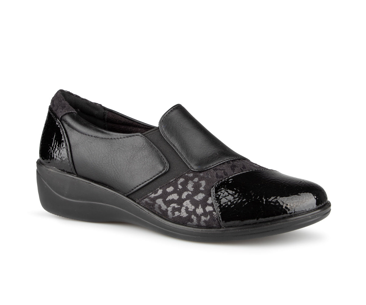 The Ultime Comfort women's loafer shoe combines style and convenience. It features an elastic upper and a 1.5-inch wedge heel, providing optimal comfort throughout the day.