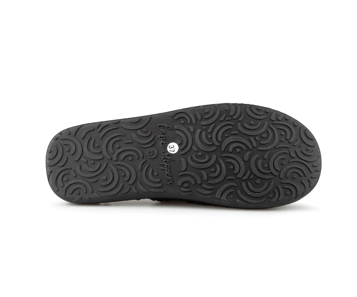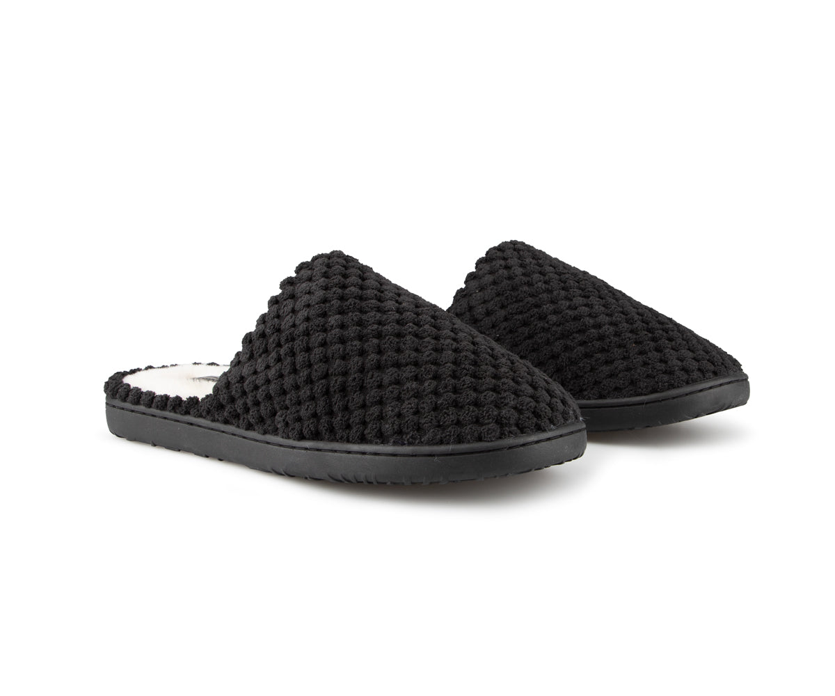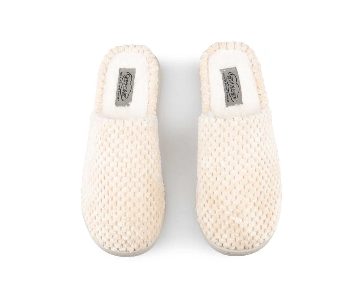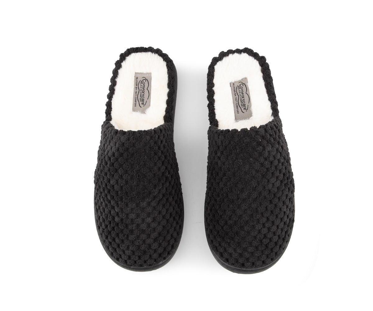 These Comfortcare women's mule slippers are made from very soft materials for optimal comfort. They feature a synthetic fleece lining and matching stitching. The black TPR sole ensures durable grip and is also finished with matching stitching for a clean finish.