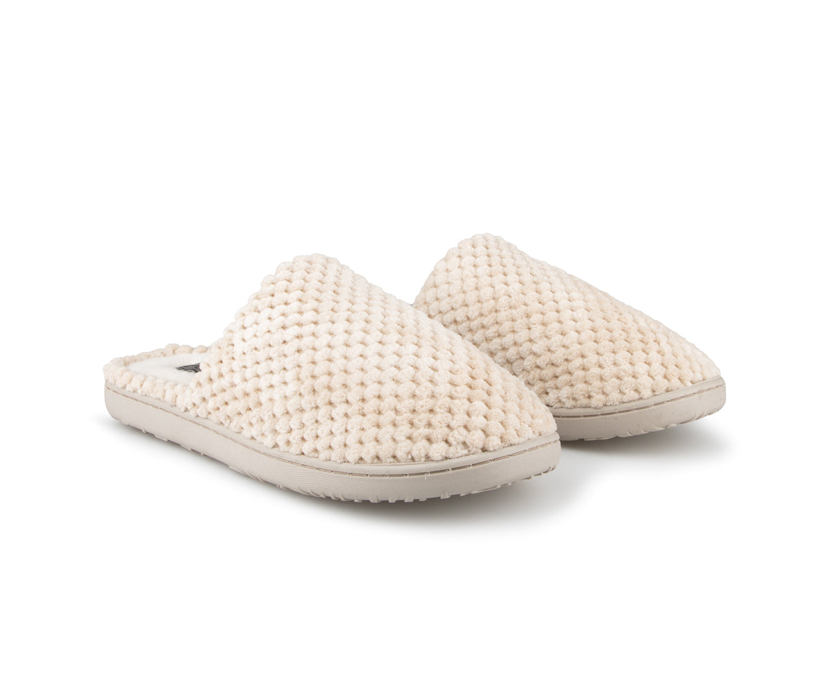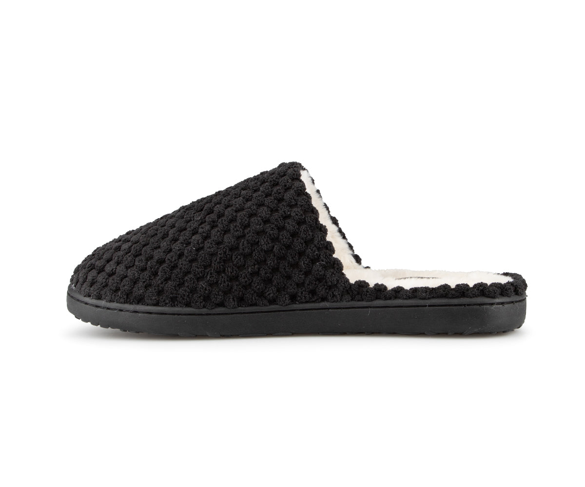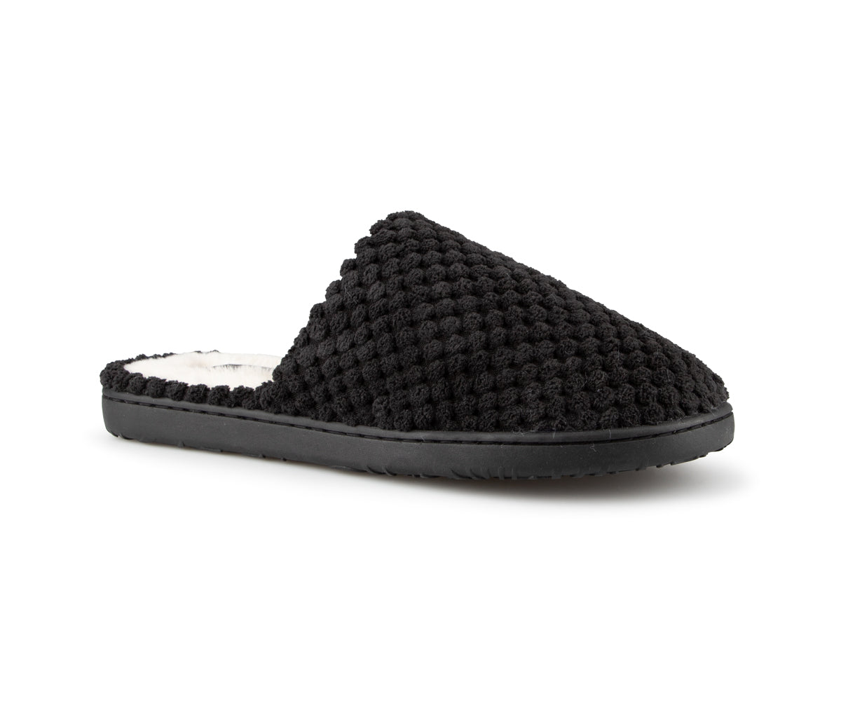 These Comfortcare women's mule slippers are made from very soft materials for optimal comfort. They feature a synthetic fleece lining and matching stitching. The black TPR sole ensures durable grip and is also finished with matching stitching for a clean finish.