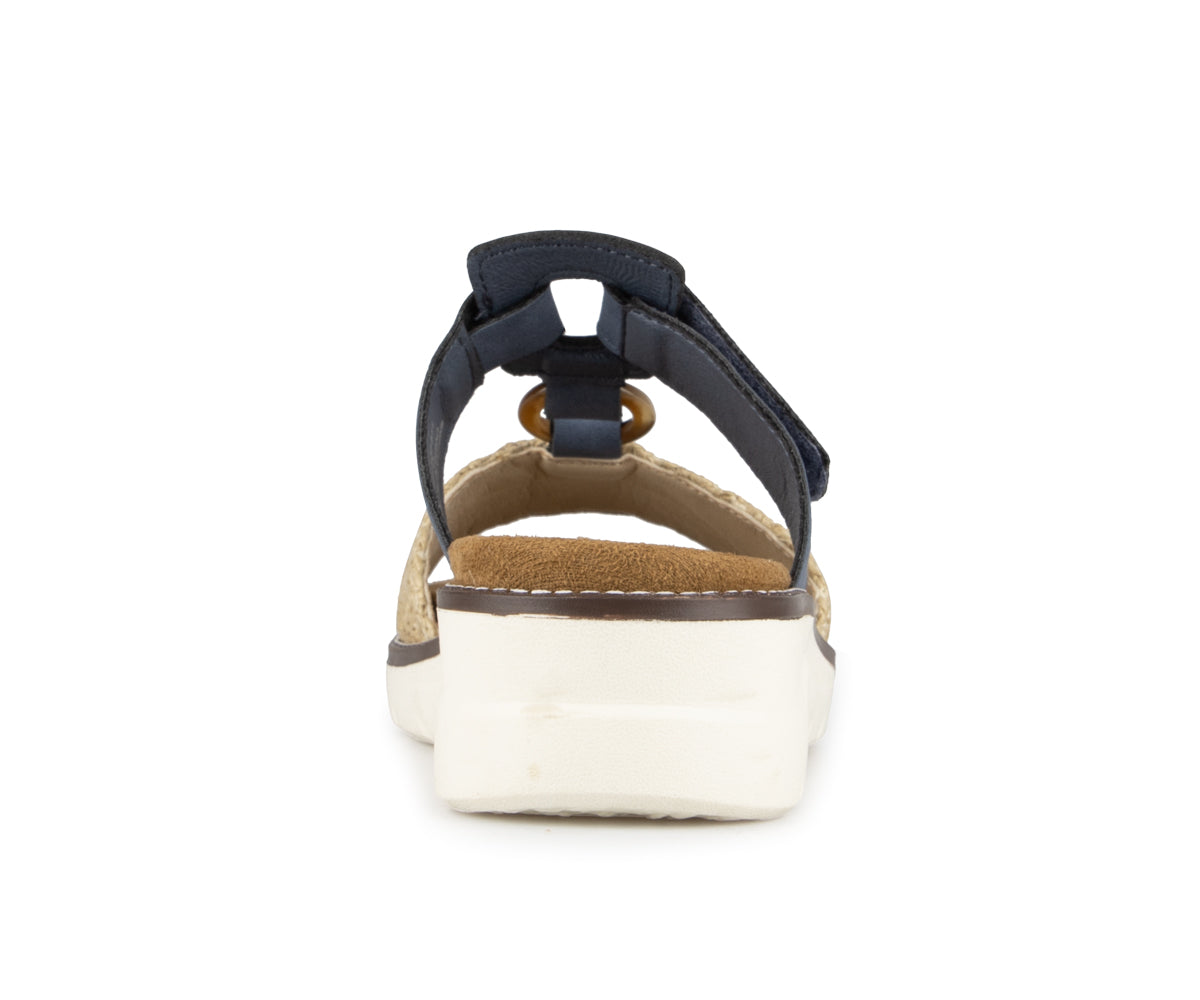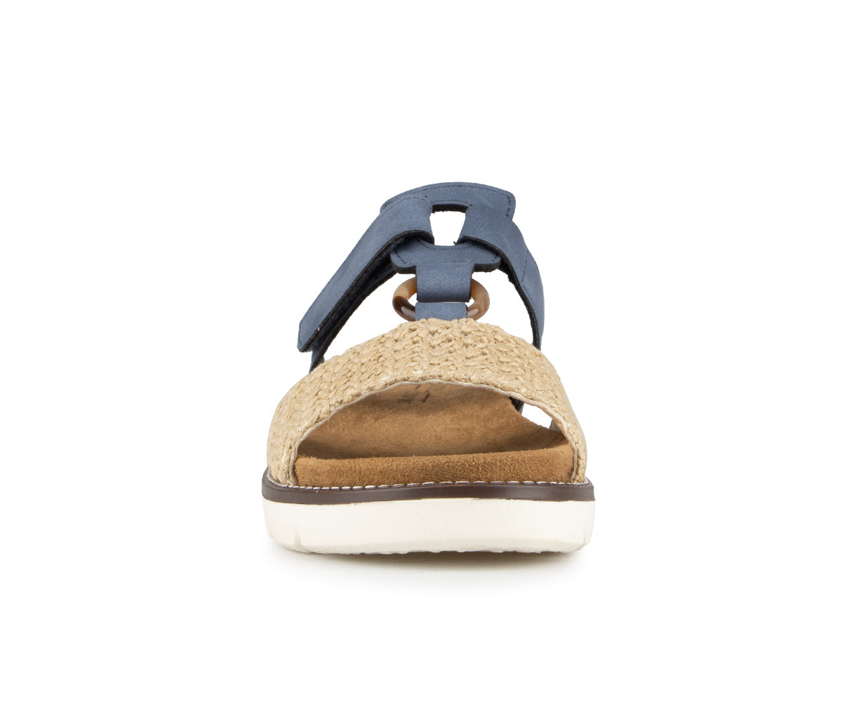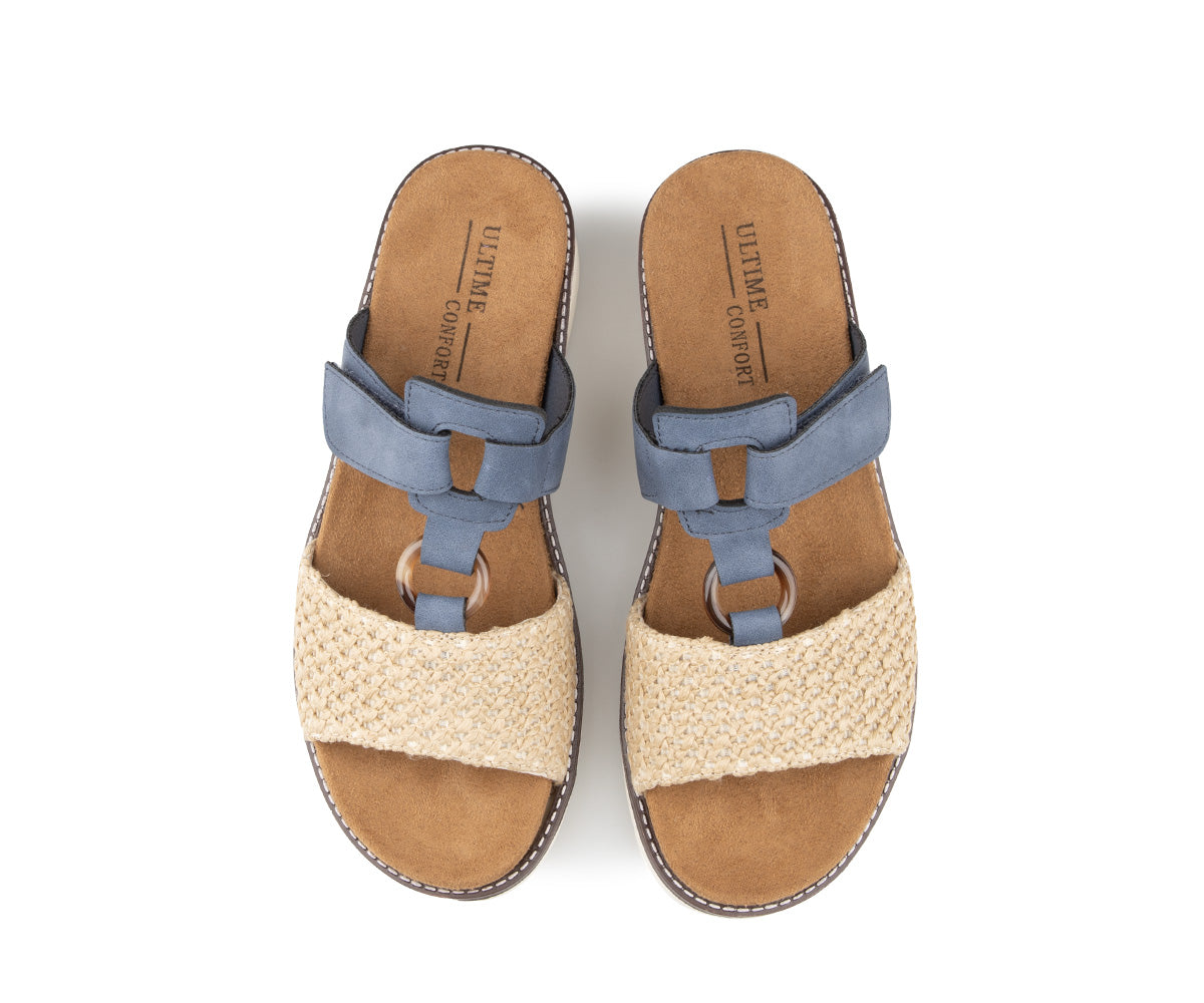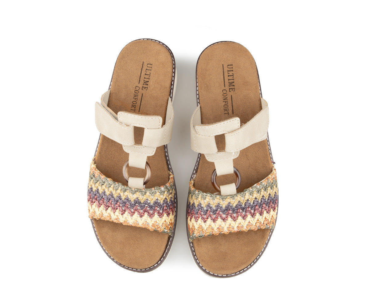 The 1.75-inch Ultimate Comfort wedge sandals for women combine refined style and everyday comfort. Made from synthetic leather and straw, they feature an elegant mule design with a velcro closure on top for easy and secure fitting. Their microfiber insole provides superior comfort, while the TPR outsole ensures excellent grip for stable and pleasant walking.