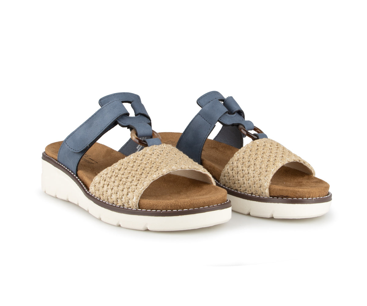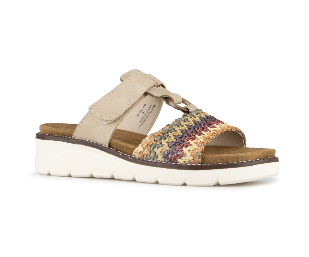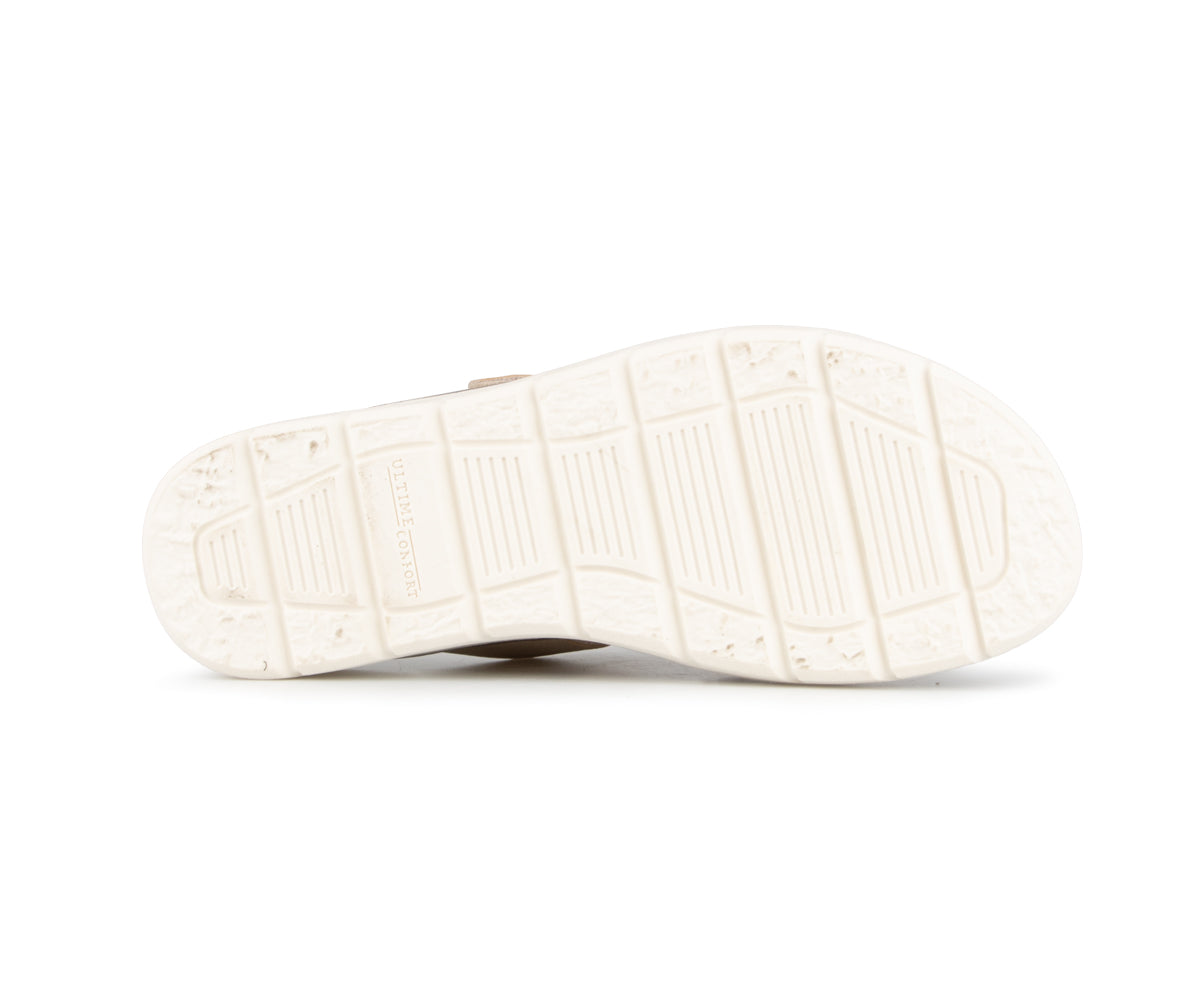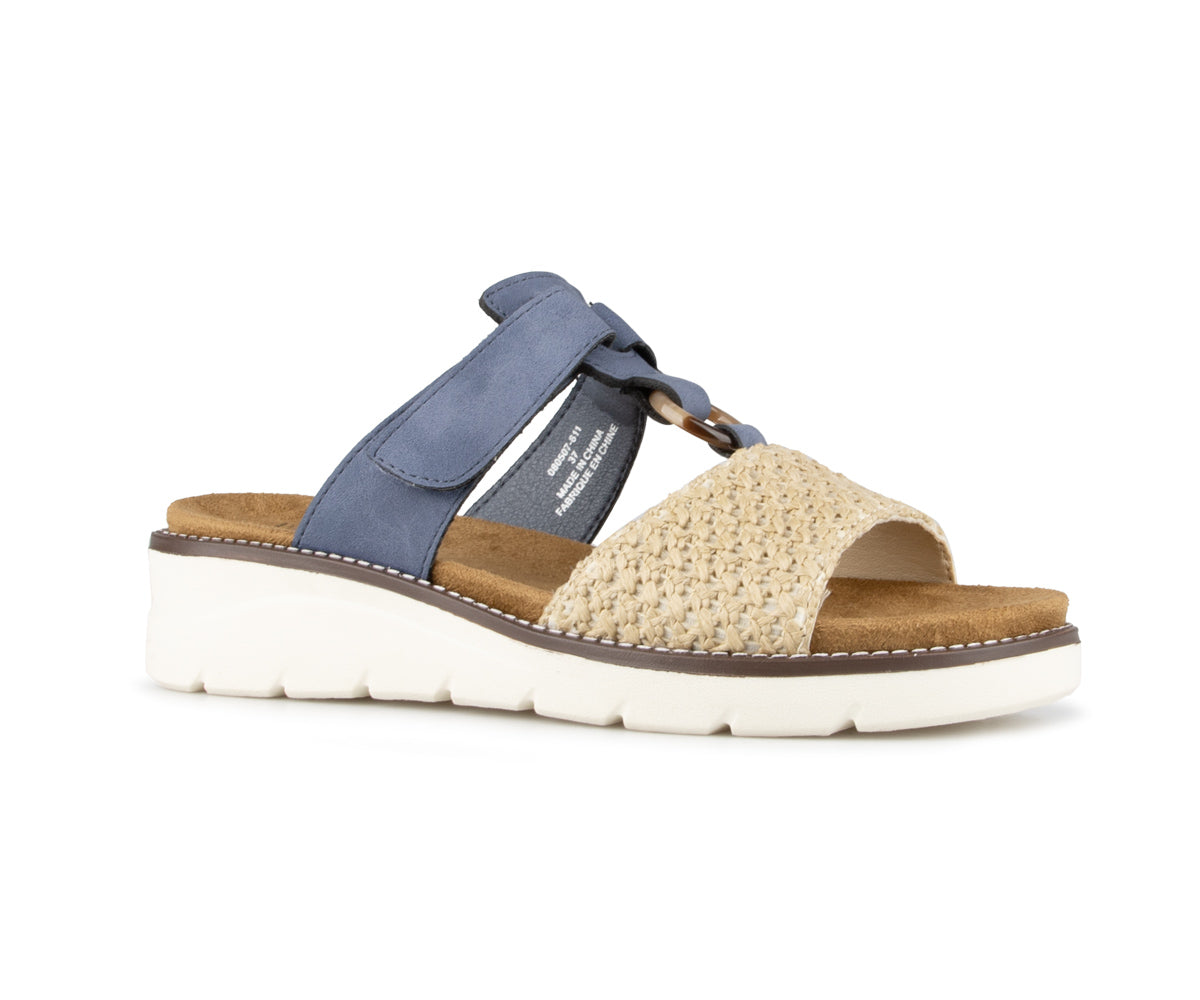The 1.75-inch Ultimate Comfort wedge sandals for women combine refined style and everyday comfort. Made from synthetic leather and straw, they feature an elegant mule design with a velcro closure on top for easy and secure fitting. Their microfiber insole provides superior comfort, while the TPR outsole ensures excellent grip for stable and pleasant walking.