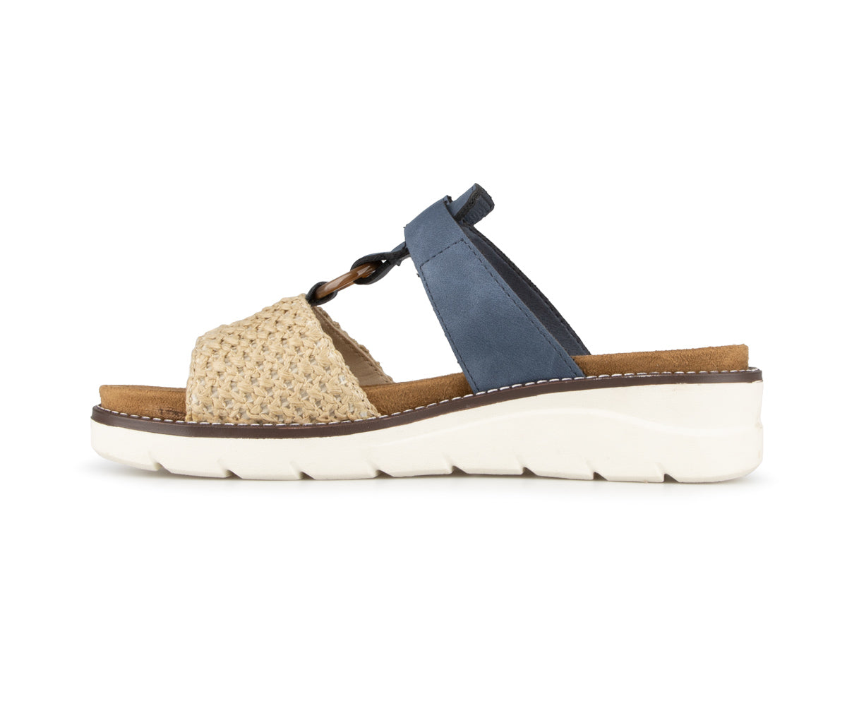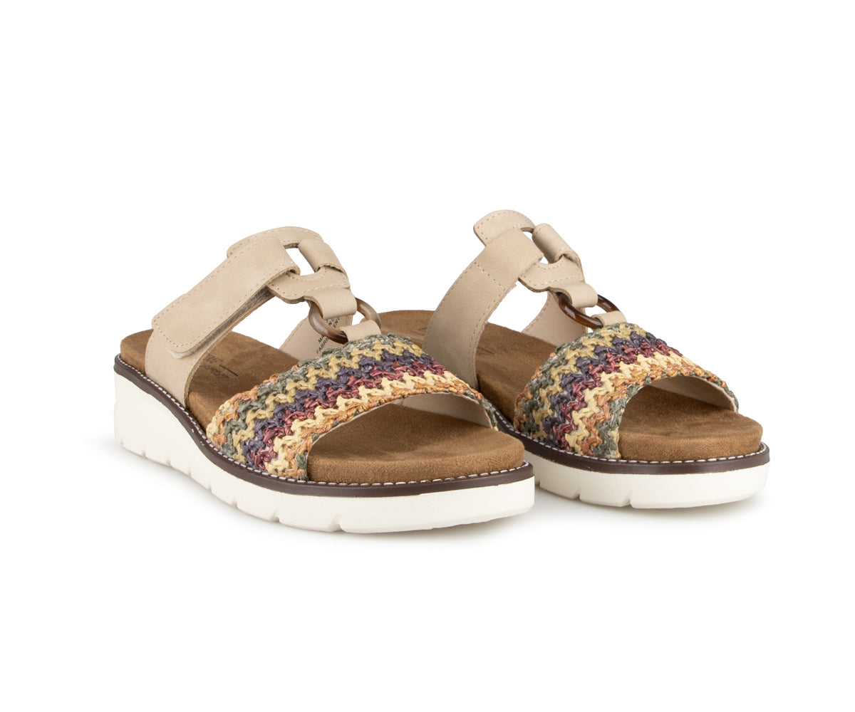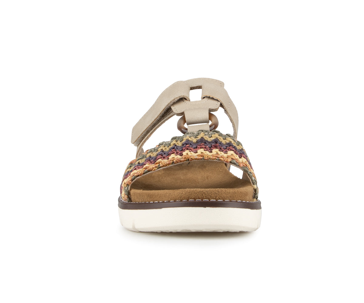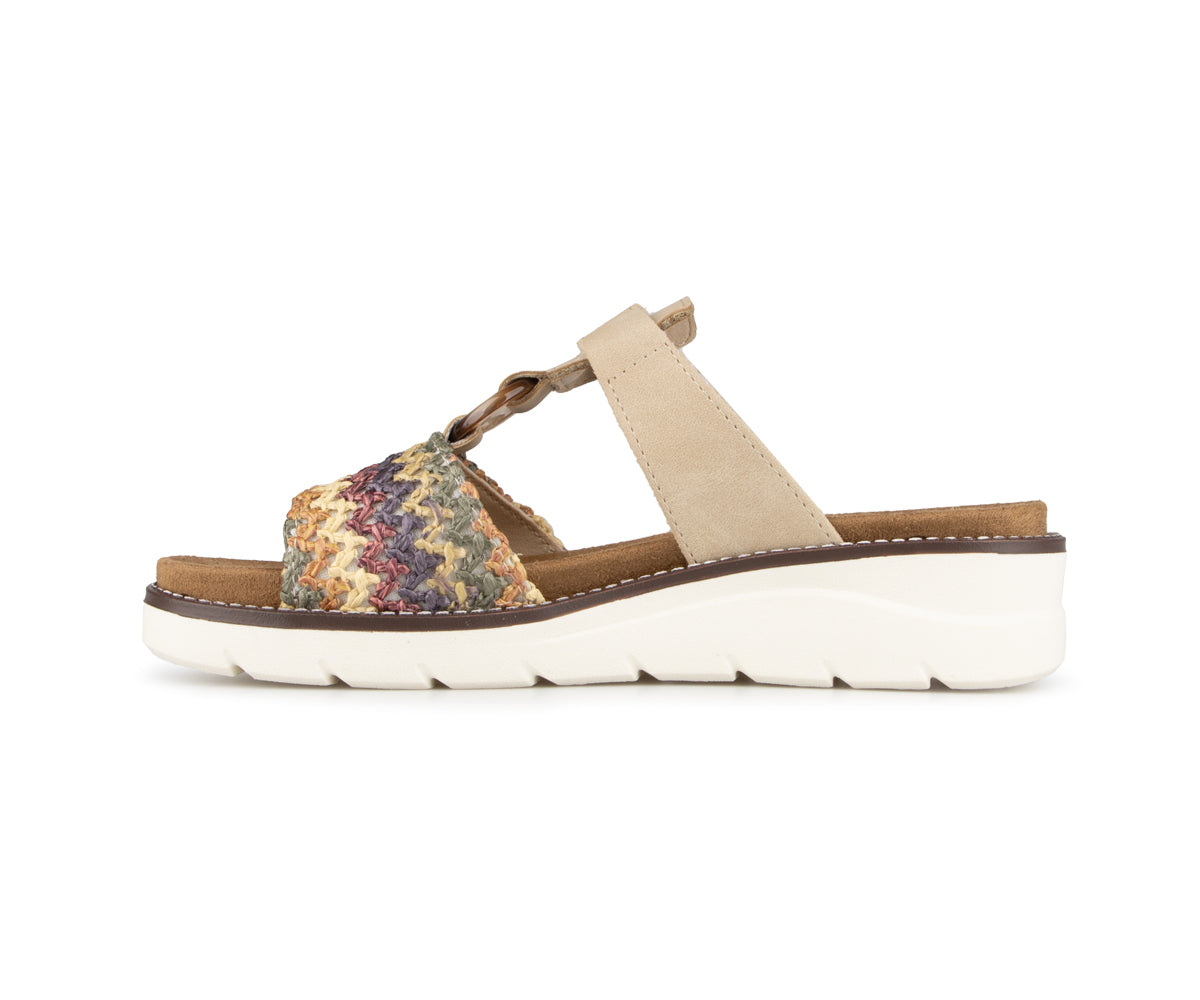 The 1.75-inch Ultimate Comfort wedge sandals for women combine refined style and everyday comfort. Made from synthetic leather and straw, they feature an elegant mule design with a velcro closure on top for easy and secure fitting. Their microfiber insole provides superior comfort, while the TPR outsole ensures excellent grip for stable and pleasant walking.