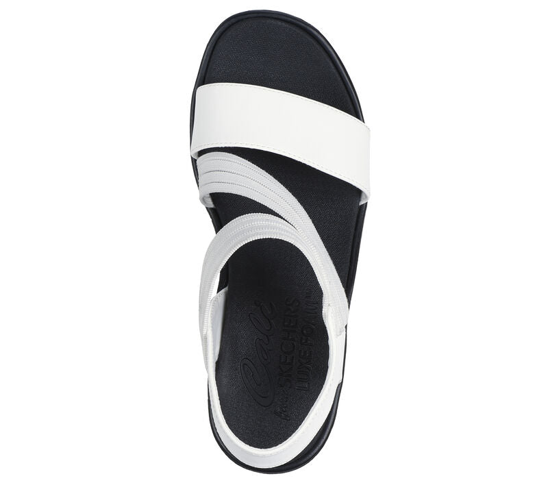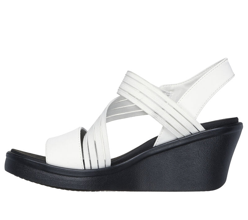 The Skechers Women's Rumble On Luxe Foam Sandals are a perfect fusion of comfort and style. Featuring elastic straps across the vamp and a wedge heel, they provide a secure fit and added support. Made with 100% vegan materials, these sandals are not only stylish, but also eco-friendly.