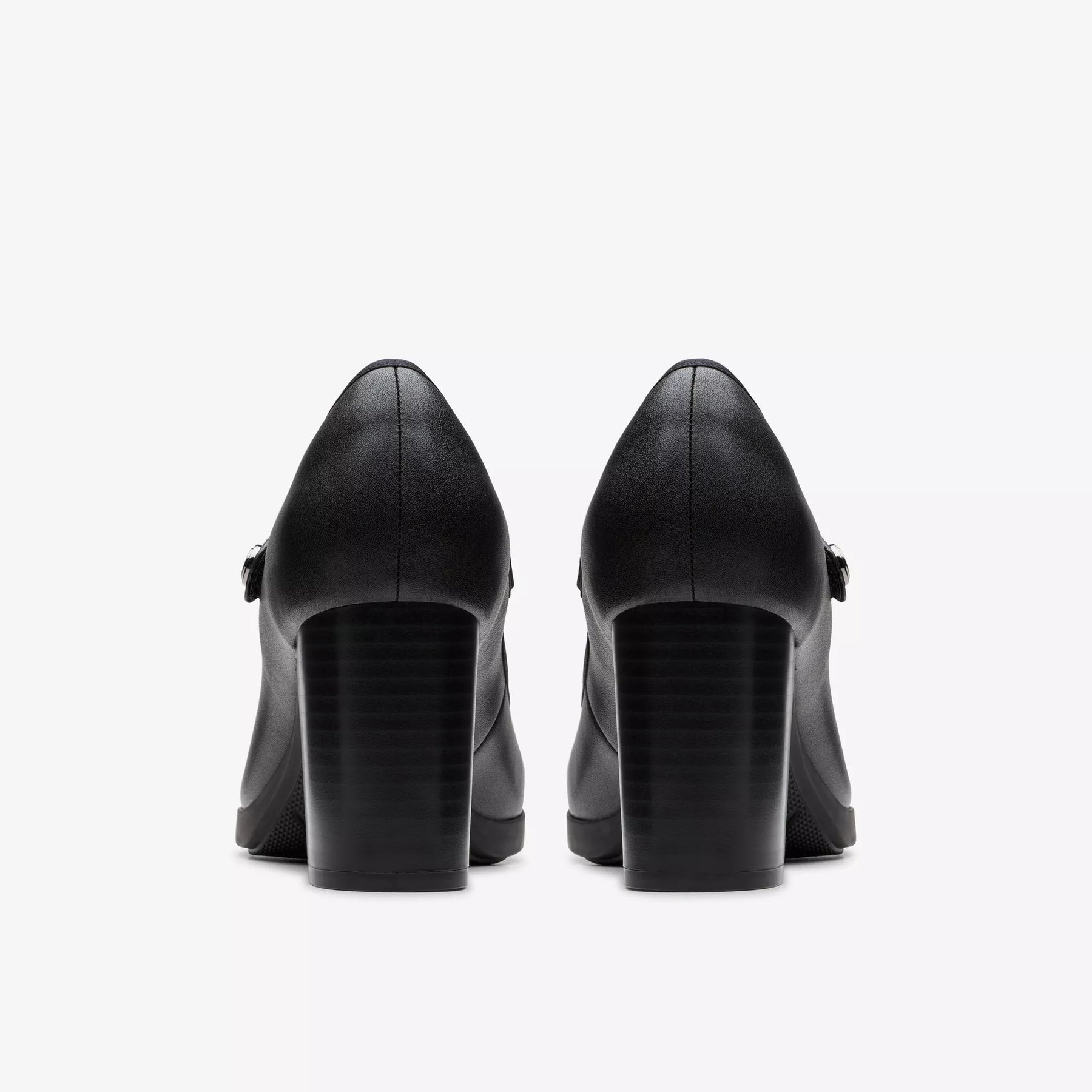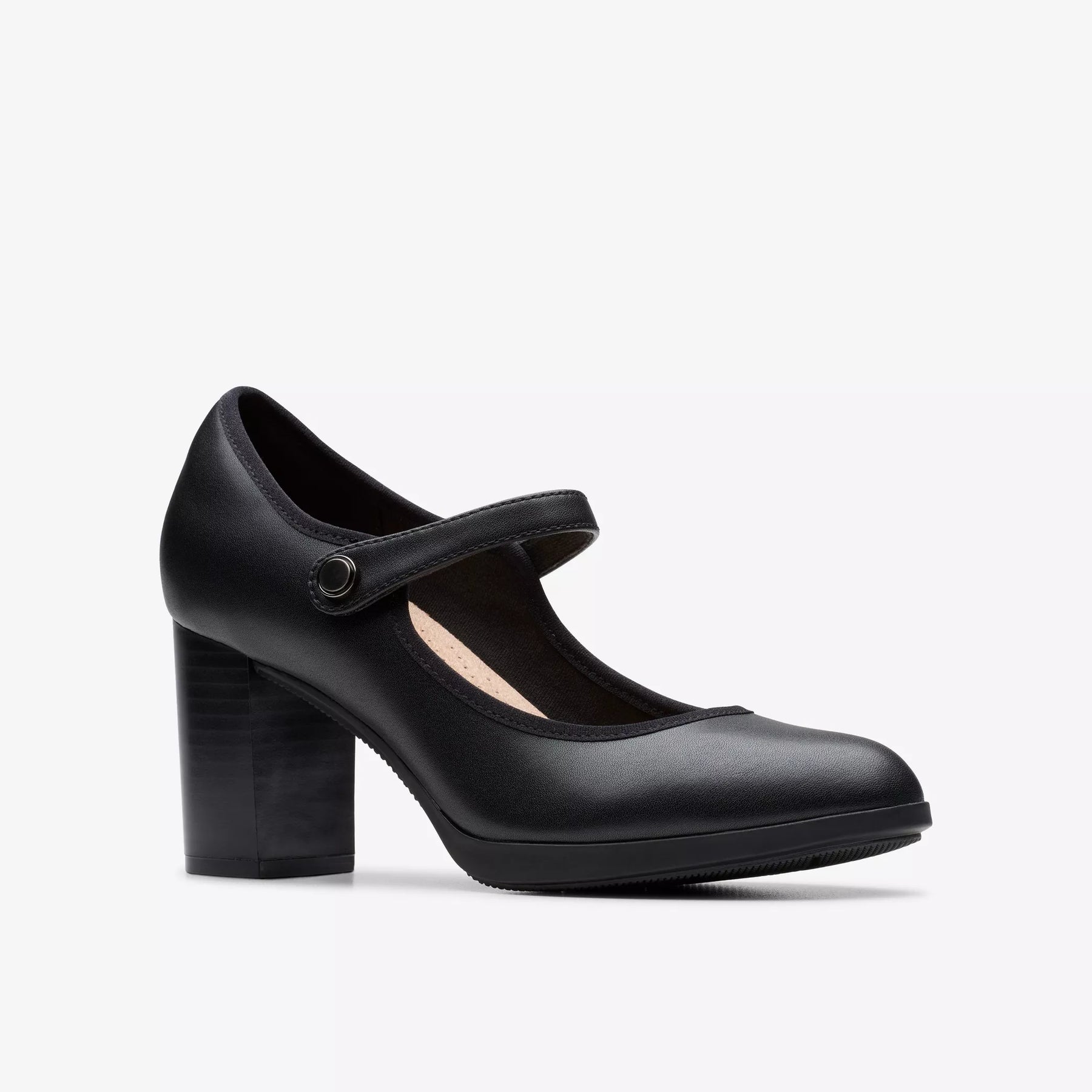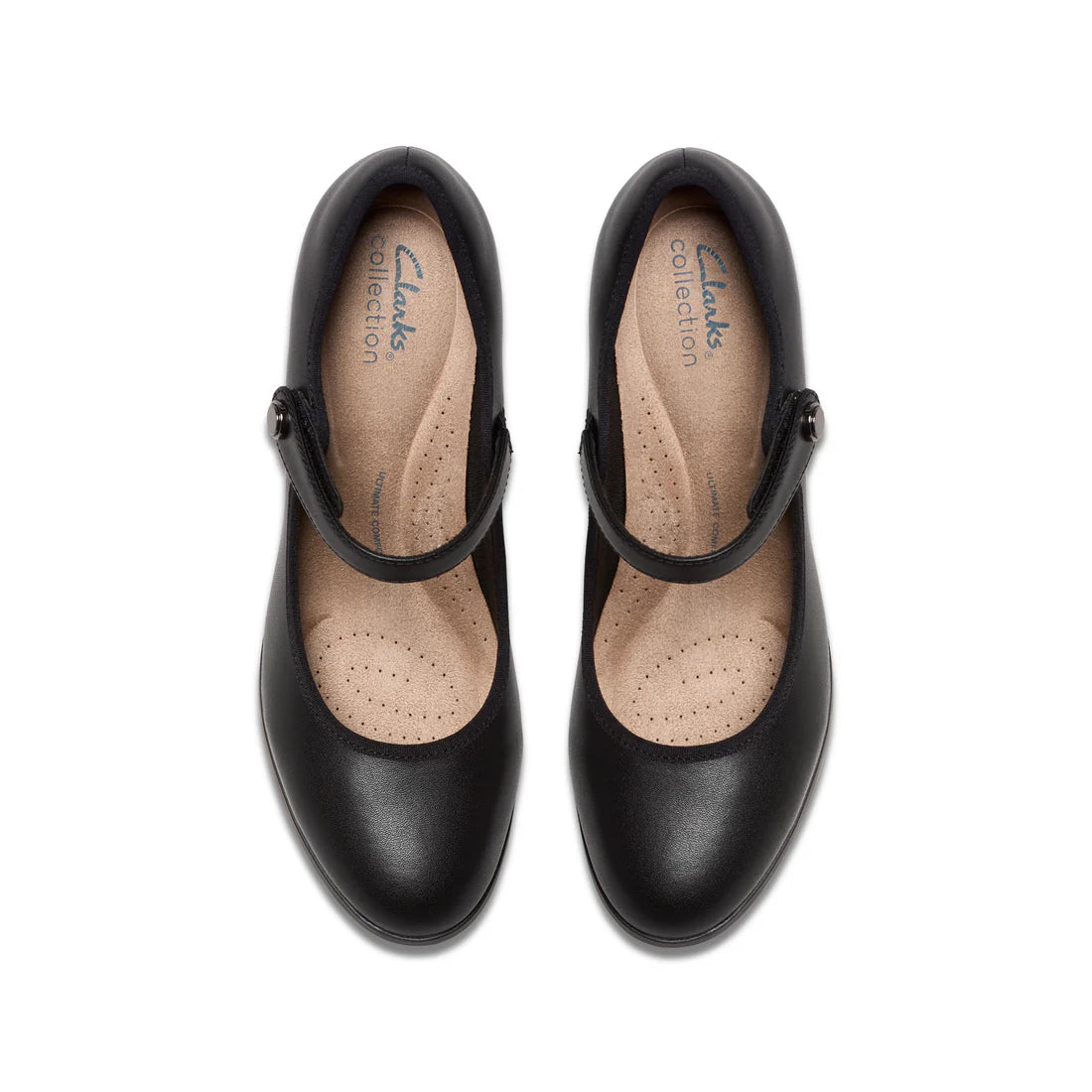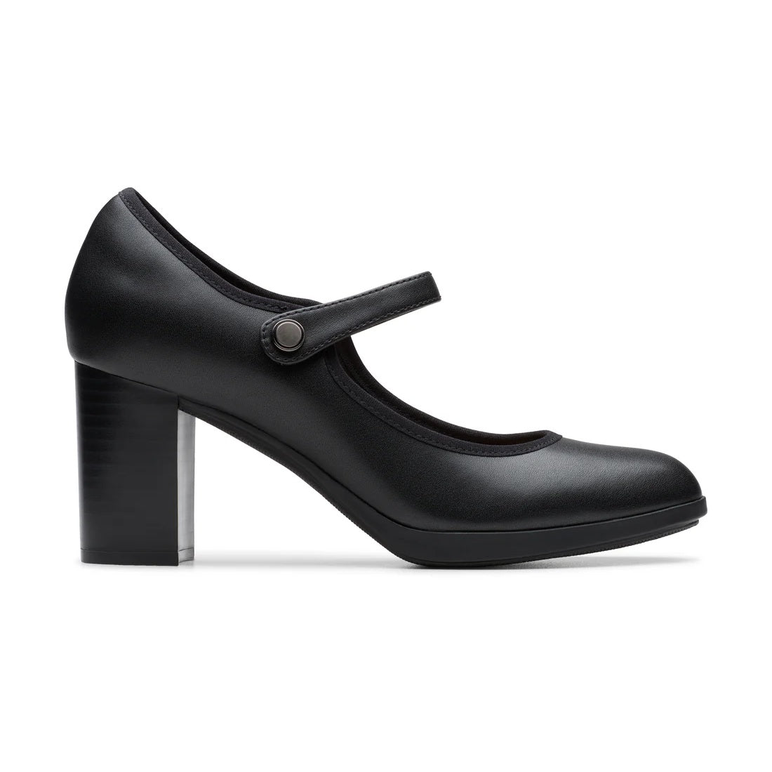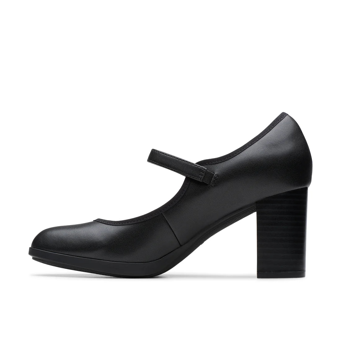 These Clarks women's high-heeled shoes combine elegance and comfort for a polished everyday style. Their premium black leather upper offers a classic look, while the Mary Jane strap ensures a stable fit. The Ultimate Comfort foam insole provides long-lasting cushioning, supported by a padded top for increased comfort. The flexible TPR sole guarantees excellent grip underfoot, and the 2.95-inch heel adds a refined touch without compromising stability.