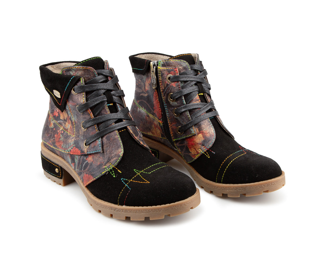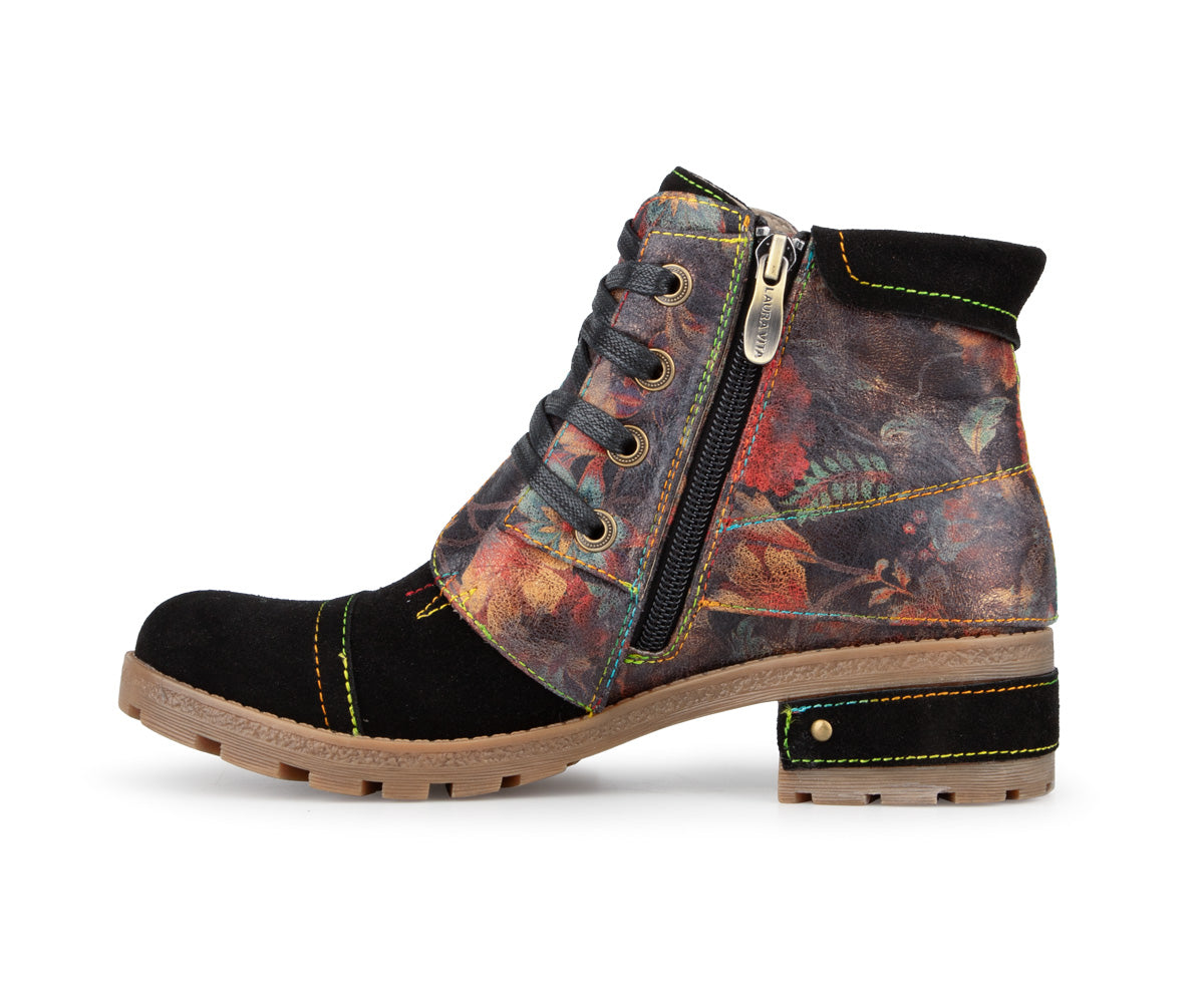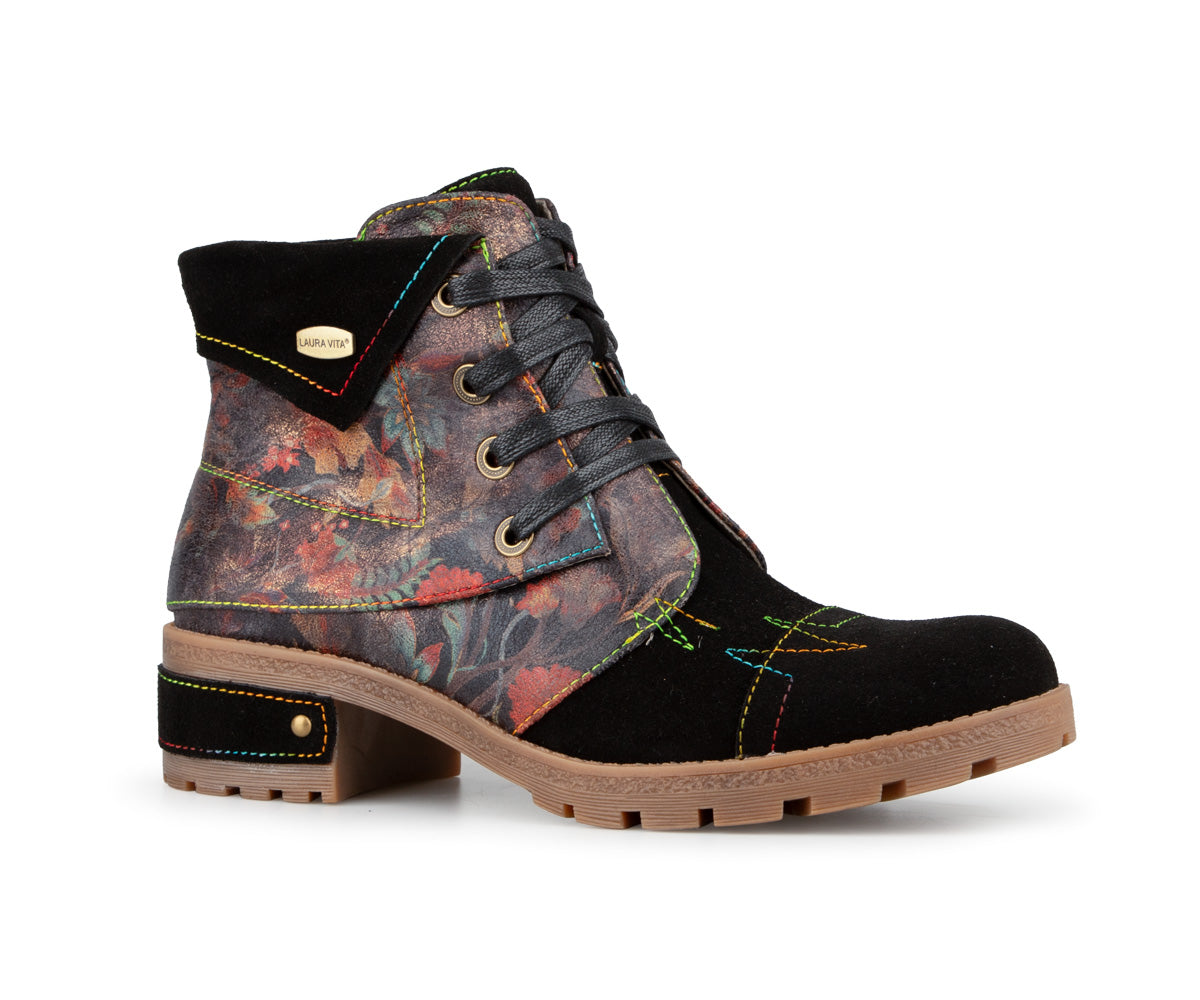 Express your style with these Laura Vita ankle boots made of printed leather with artistic details. Their mid heel offers a good balance between comfort and feminine allure, perfect for daily use. Featuring a convenient inner zipper, soft textile lining, and leather insole, these ankle boots perfectly combine comfort and refinement. The rubber outsole ensures good grip with every step.