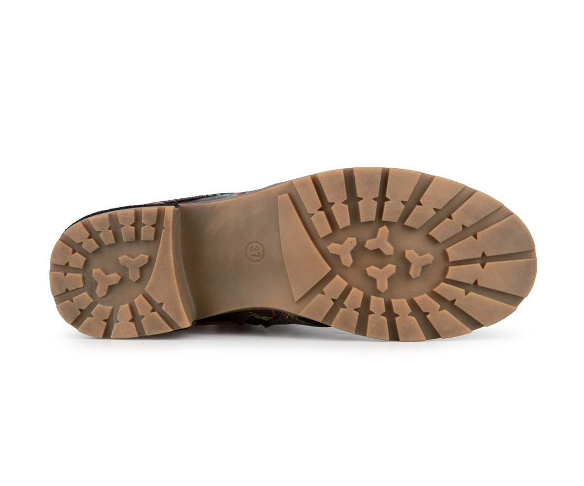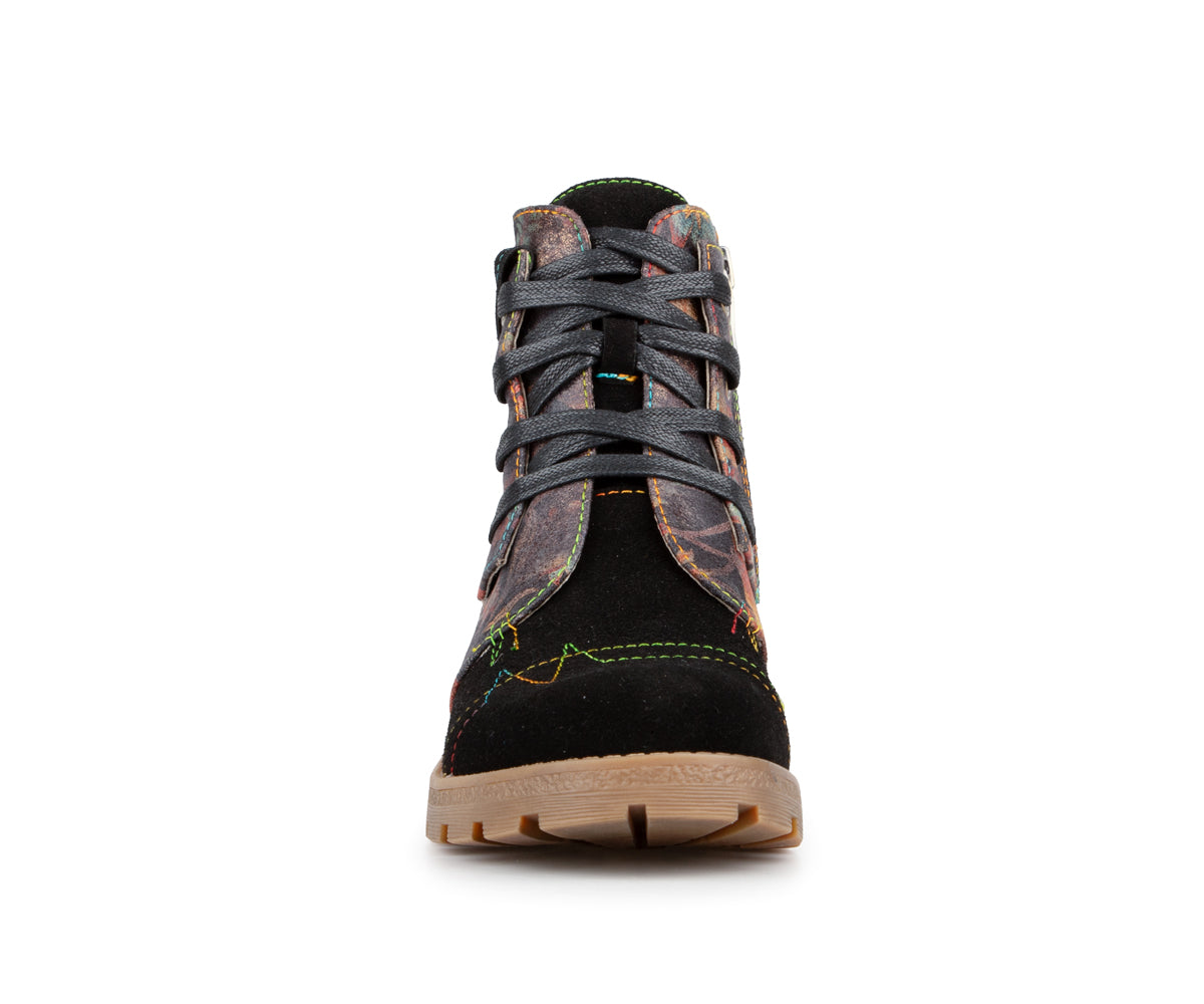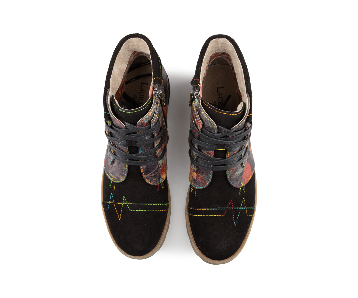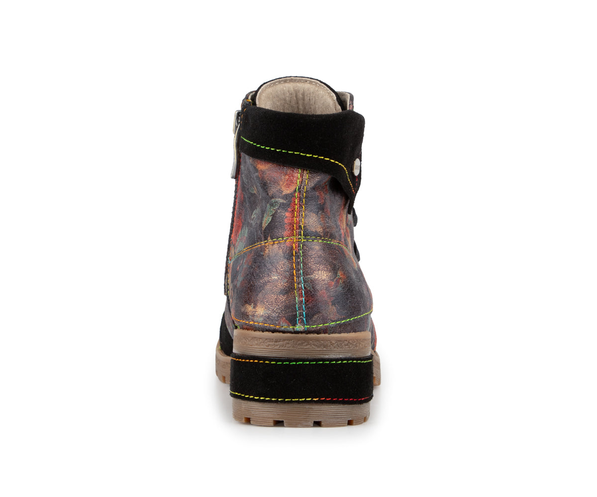 Express your style with these Laura Vita ankle boots made of printed leather with artistic details. Their mid heel offers a good balance between comfort and feminine allure, perfect for daily use. Featuring a convenient inner zipper, soft textile lining, and leather insole, these ankle boots perfectly combine comfort and refinement. The rubber outsole ensures good grip with every step.