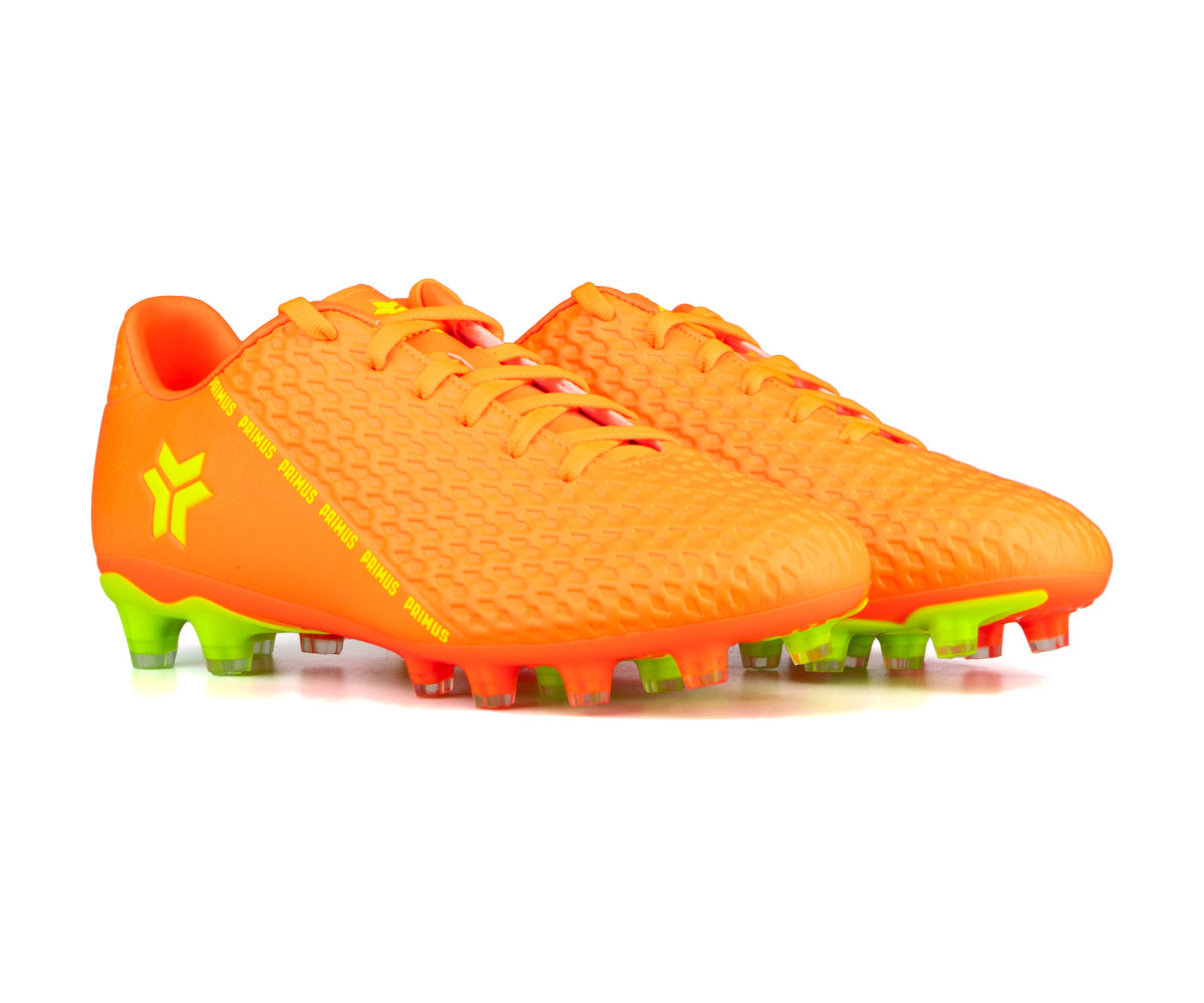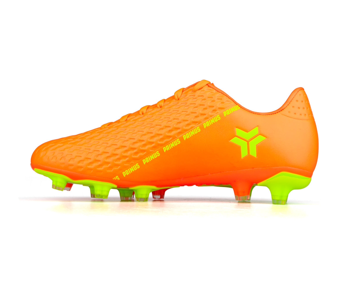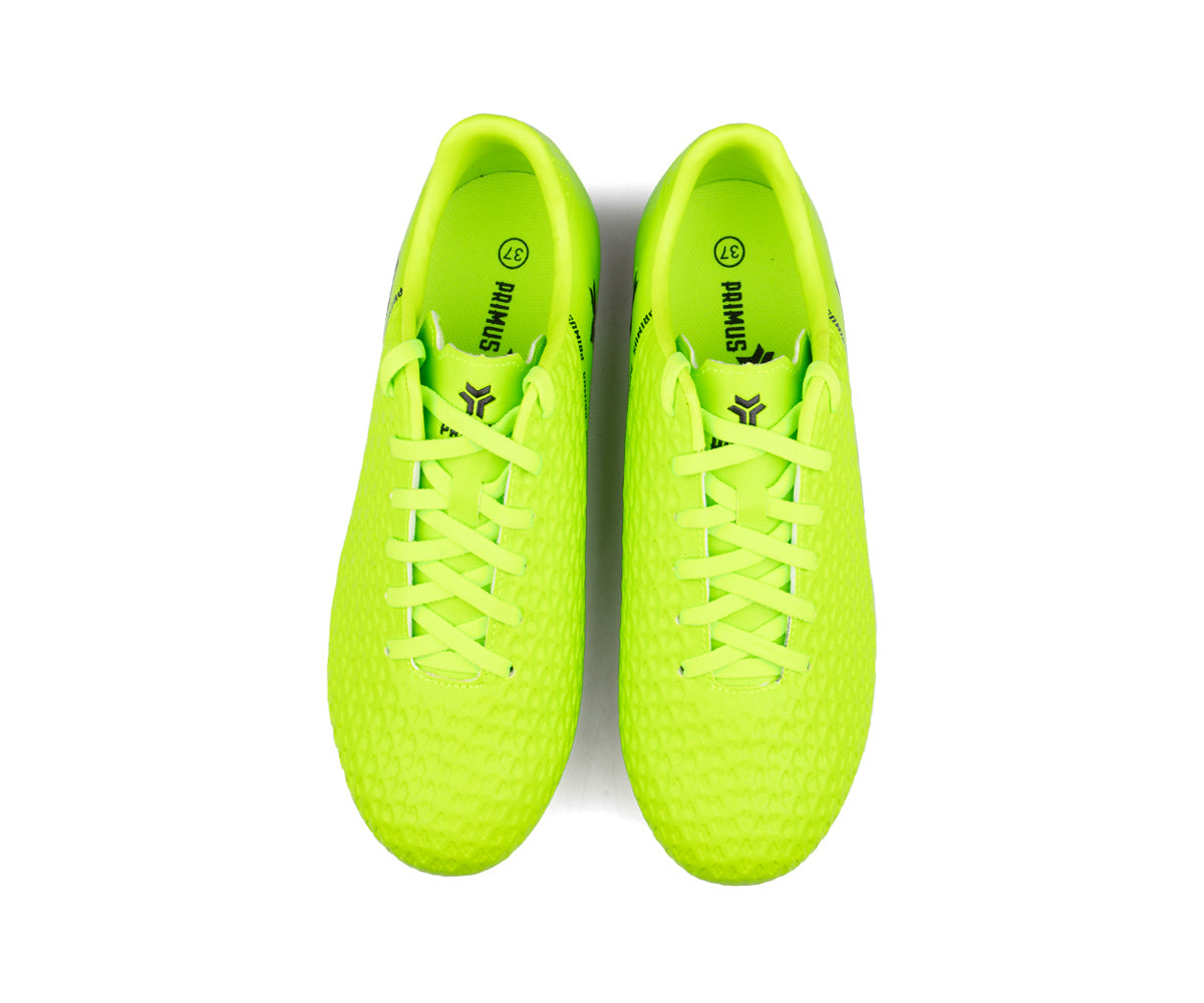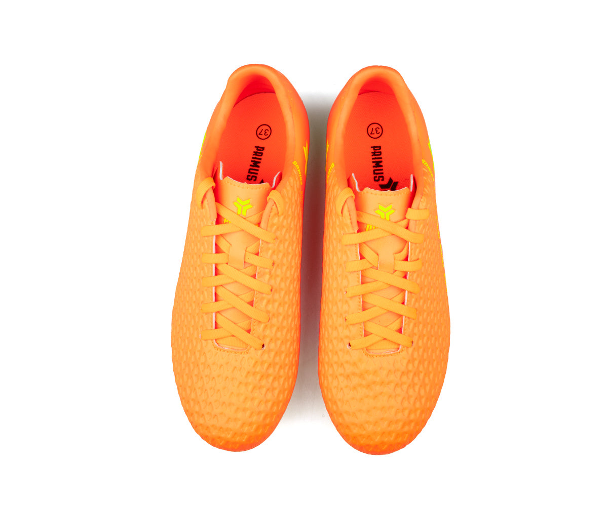 Primus kids' soccer shoes designed for outdoor grass surfaces. Their durable synthetic upper provides good support, while the TPU sole with cleats ensures optimal traction on the field. The classic lacing allows for a precise fit to support them in every game.