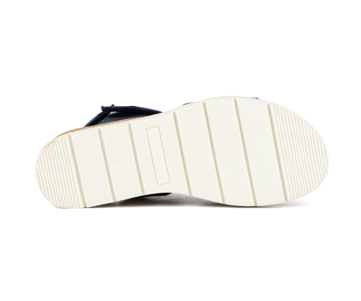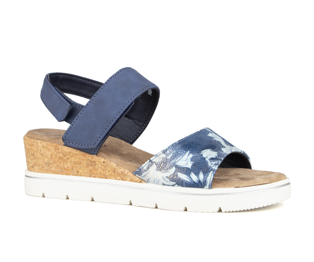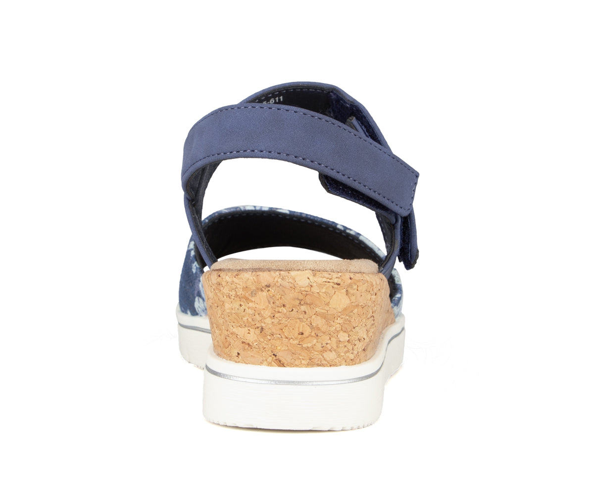 Sandales à talon compensé Alberto pour femmes, fabriquées en cuir synthétique et tissu imprimé pour un style estival élégant. La bride à velcro facilite l’enfilage et assure un ajustement personnalisé, tandis que la semelle en TPR avec compartiment recouvert de liège offre confort, légèreté et stabilité tout au long de la journée.