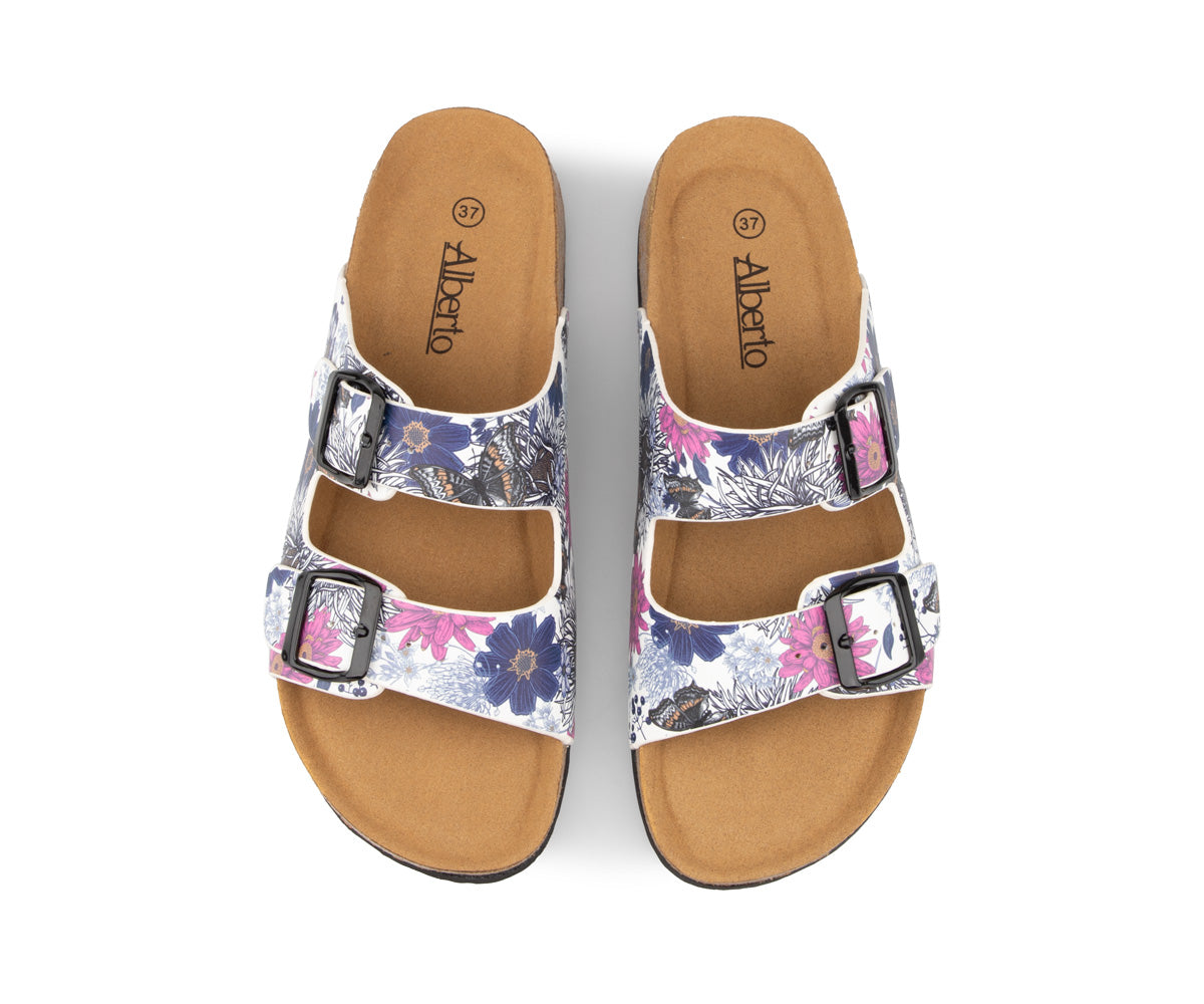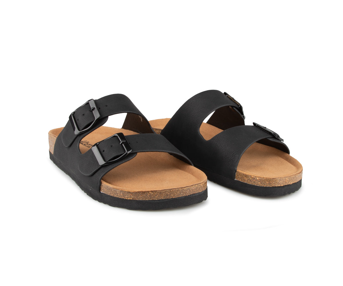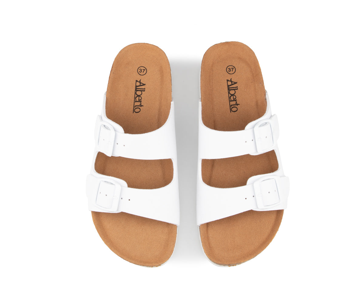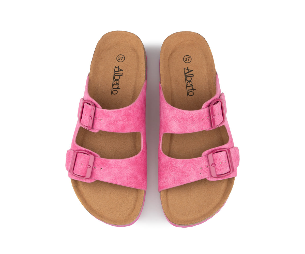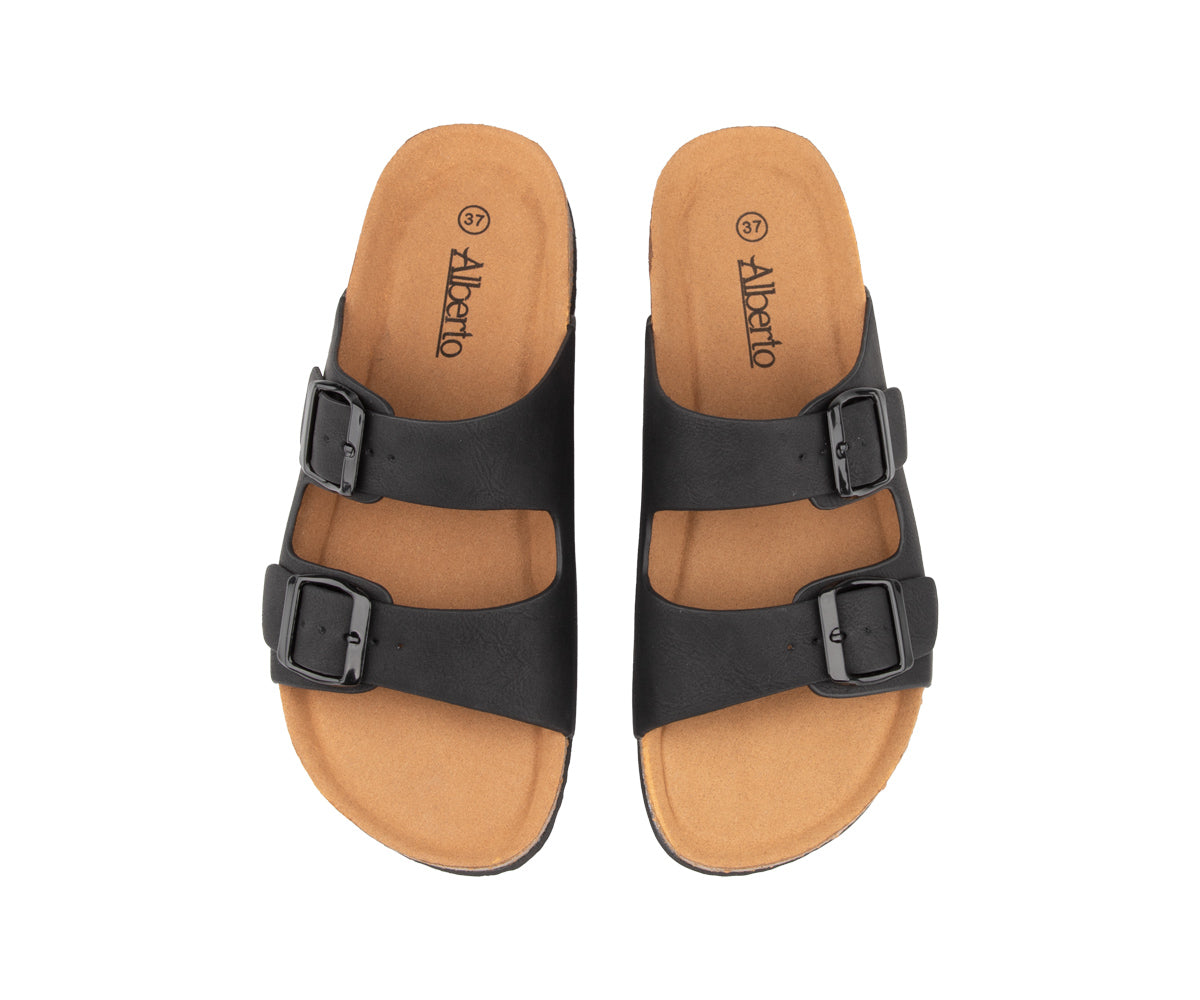 Les sandales de type mule Alberto pour femme combinent confort et style décontracté. Fabriquées avec une empeigne en cuir synthétique et une semelle en microfibre effet liège, elles offrent un design élégant et pratique. La semelle extérieure en EVA garantit légèreté et adhérence, tandis que les deux boucles ajustables sur le dessus permettent un ajustement parfait.