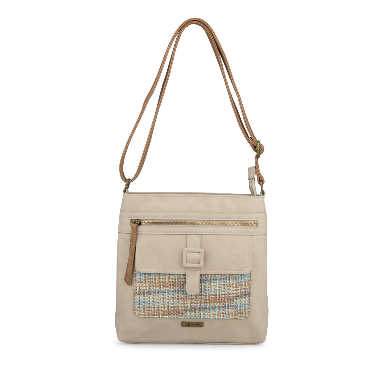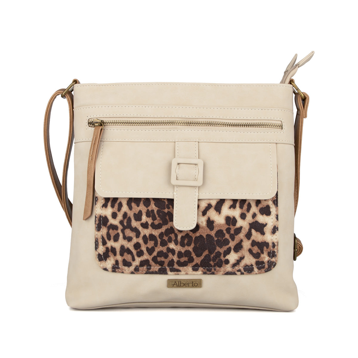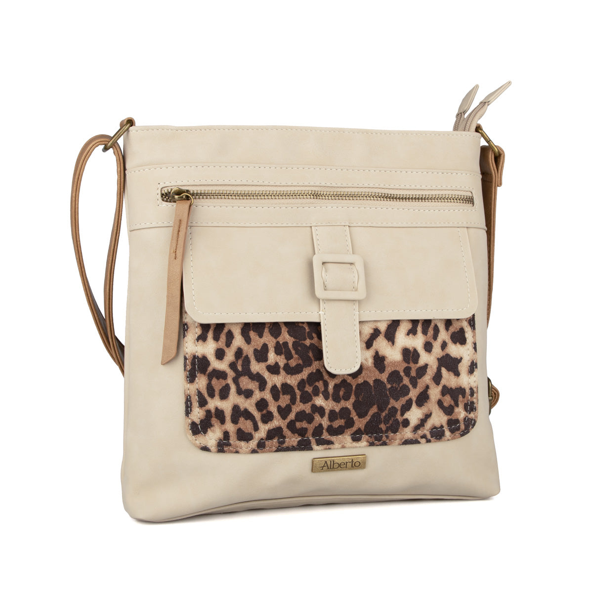 Sac à main Alberto pour femmes en cuir synthétique, combinant élégance et praticité. L’intérieur en tissu imprimé apporte une touche féminine, tandis que les deux compartiments avec fermeture éclair permettent un rangement organisé et un accès rapide aux essentiels. La bandoulière ajustable offre un port confortable et polyvalent.